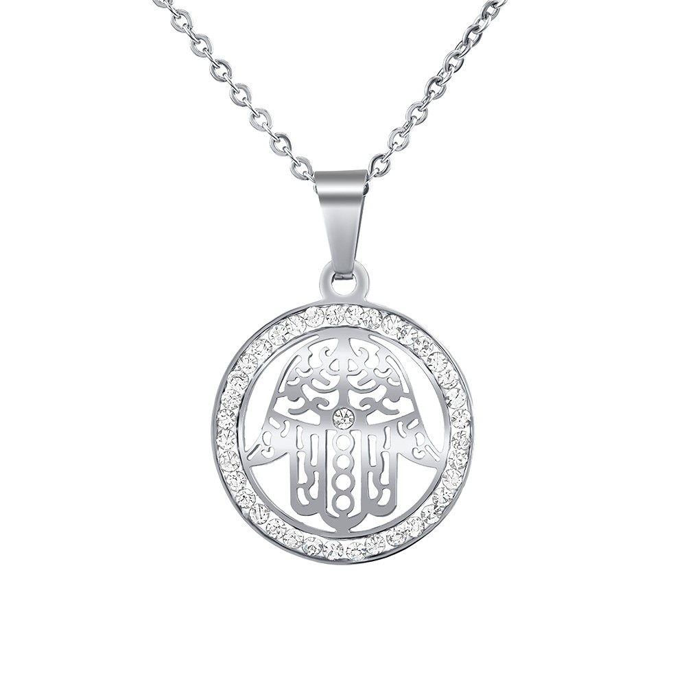 Silvego Oceľový náhrdelník s príveskom ruky Fátimy s krištáľom KMM39914N