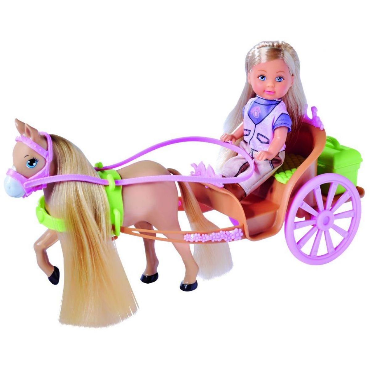 Má na sebe oblečený svetlý jazdecký obleček, jej dlhé blond vlásky jej splývajú až pod ramená. Koník sa môže pýšiť krásnou hrivou, dlhou až k zemi. Kočiar s ružovými kolesami a opratami má v zadnej časti odkladací priestor na uloženie cestovnej batožiny. Dievčatká sa tak s Evičkou a koníkom môžu vypraviť na výlet, napríklad do parku na vychádzku.
