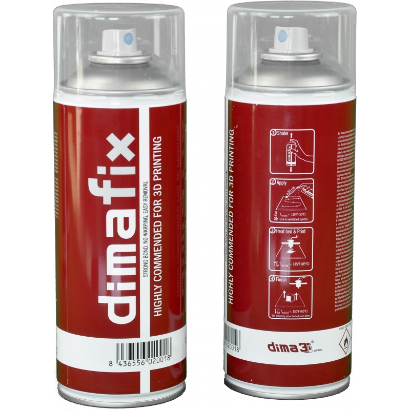 DimaFix Adhesive Spray je lepiaci sprej s aerosólom. DimaFix Spray zaisťuje ideálne a teplotne závislú adhéziu ABS 3D vytlačí na výhrevný lôžko 3D Tiskárny. Vzhľadom k teplotnej závislosti DimaFixu sa aktivuje lepidlo a adhézie spreja od teploty 60 ° C a vyššej. pri teplote nižšej ako 60 ° C nemá postrek žiadne vlastnosti zlepšujúce adhéziu. Adhézny sprej DimaFix je úplne rozpustný vo vode. Návod na použitie: 1. Vyčistite tlačovú plochu tlačiarne. 2. Uistite sa, že na tlačovej podložke je teplota nižšia ako 50°C! 3. Lepiaci sprej Dimafix niekoľko sekúnd pretrepte, potom ho aplikujte nástrekom na (nevyhriatu; T bed & lt; 50 ° C!) tlačovú podložku zo vzdialenosti cca 30 cm. 4. Počkajte niekoľko sekúnd, než povrch uschne, až potom vyhrejte podložku na požadovanú teplotu. Teplotu voľte podľa zvoleného typu materiálu a odporúčaných pracovných teplôt Dimafixu viď tabuľka vyššie. 3D tlač môže začať. 5. Po tlači 3D objektu počkajte, než sa tlačové lôžko úplne ochladí(Tbed