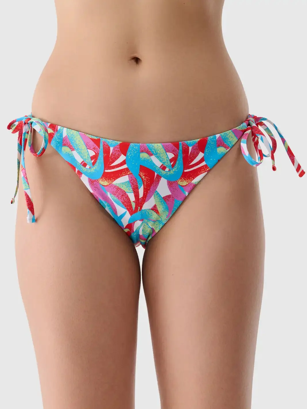 Spodná časť plaviek zaujme originálnym vzorom. Strih je klasický a lichotivý, s miernym výstrihom, ktorý zvýrazňuje postavu. Na bokoch sú nastaviteľné šnúrky, ktoré umožňujú individuálne prispôsobenie a dodávajú plavkám hravý prvok. Ideálna voľba pre milovníčky štýlových plaviek.