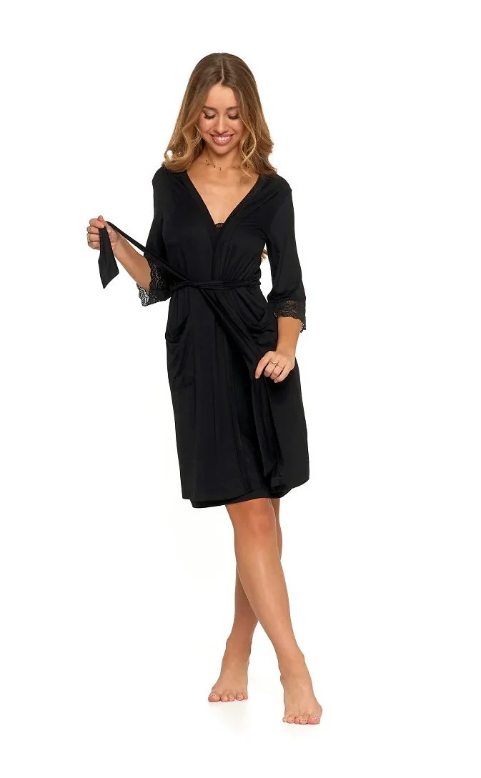 Dámsky župan - vyrobený z kvalitnej bavlny - 7/8 rukáv - manžety zdobené jemnou čipkou - viazanie v páse - vrecká na bokoch - balené v plastovom vrecku Zloženie: 95 % viskóza, 5 % elastan