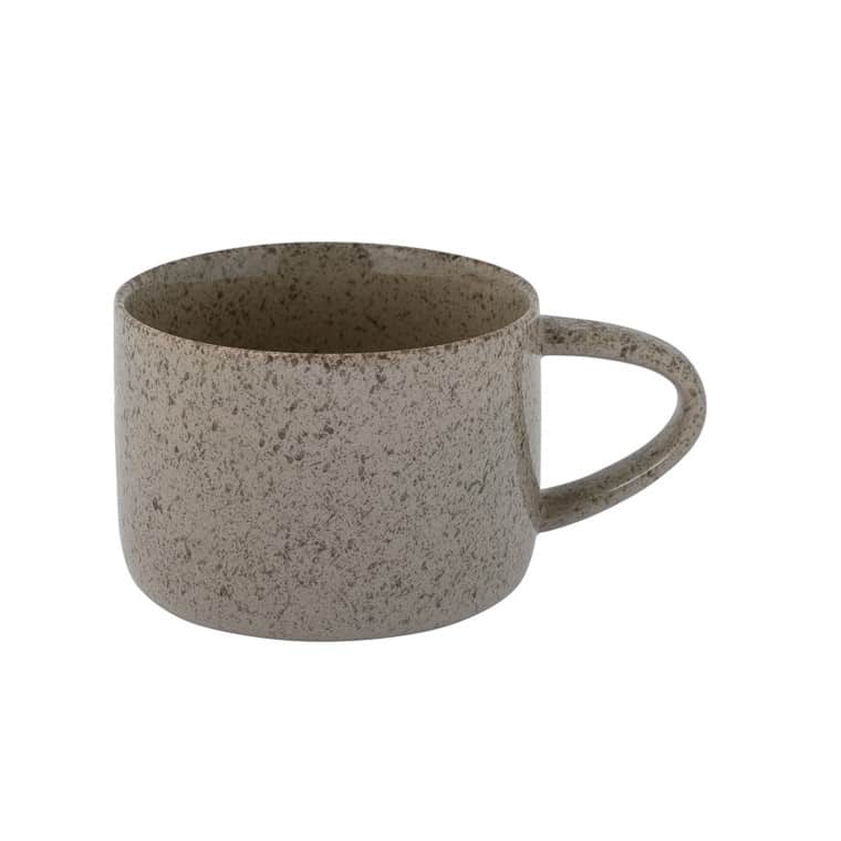 Je vyrobený z keramiky v sivej farbe zdobenej strakatou glazúrou, ktorá mu dodáva moderný vzhľad. Vďaka ušku sa veľmi dobre drží v ruke.