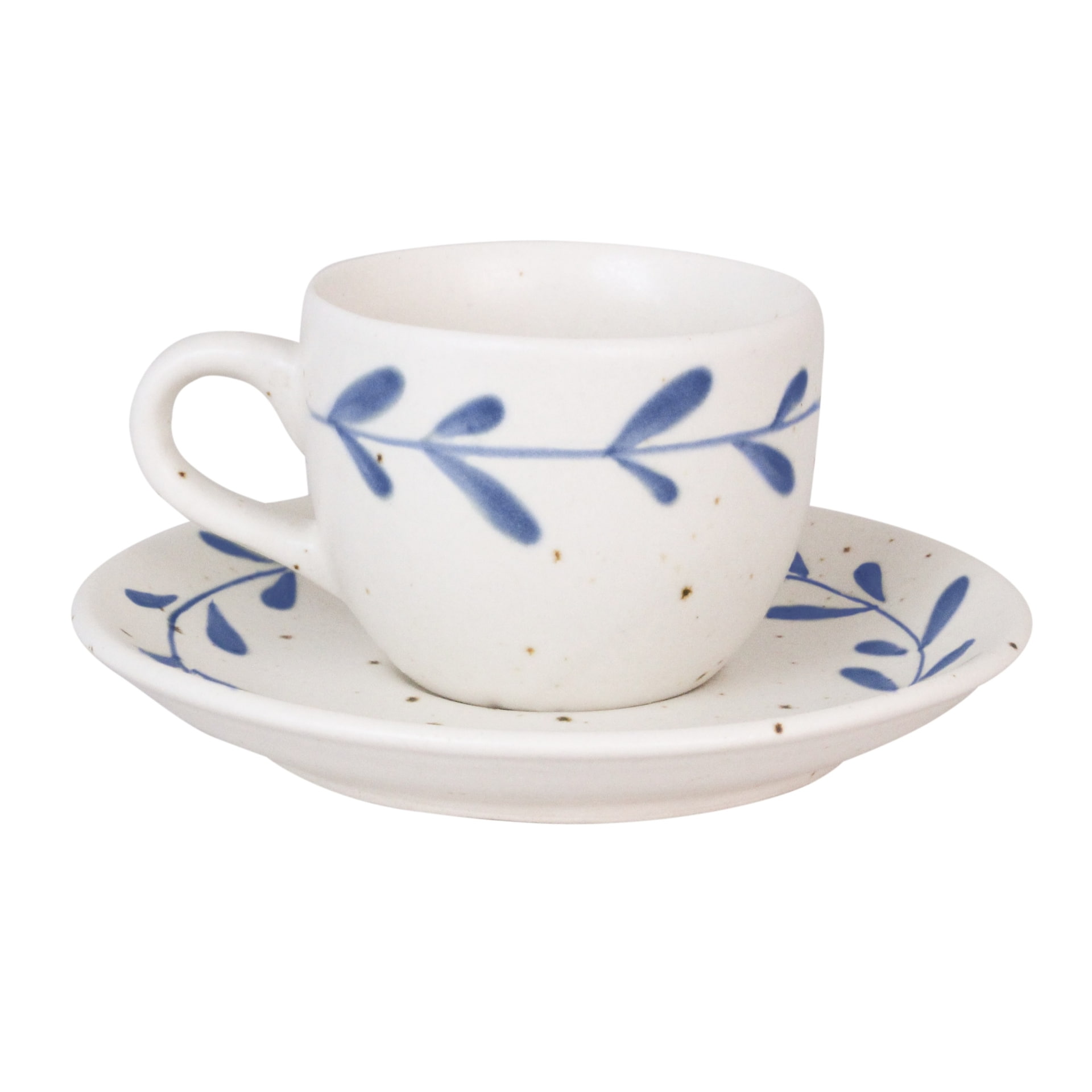 Šálka a podšálka majú jemný motív modrej vetvičky, ktorý sa vinie okolo šálky a lemuje aj okraj podšálky. Kamenina tiež necháva vyniknúť drobný posypový vzor, ktorého intenzita sa mení v závislosti od teploty výpalu, spolu s ručne maľovanou vetvičkou. Každý kus je tak úplne jedinečný.