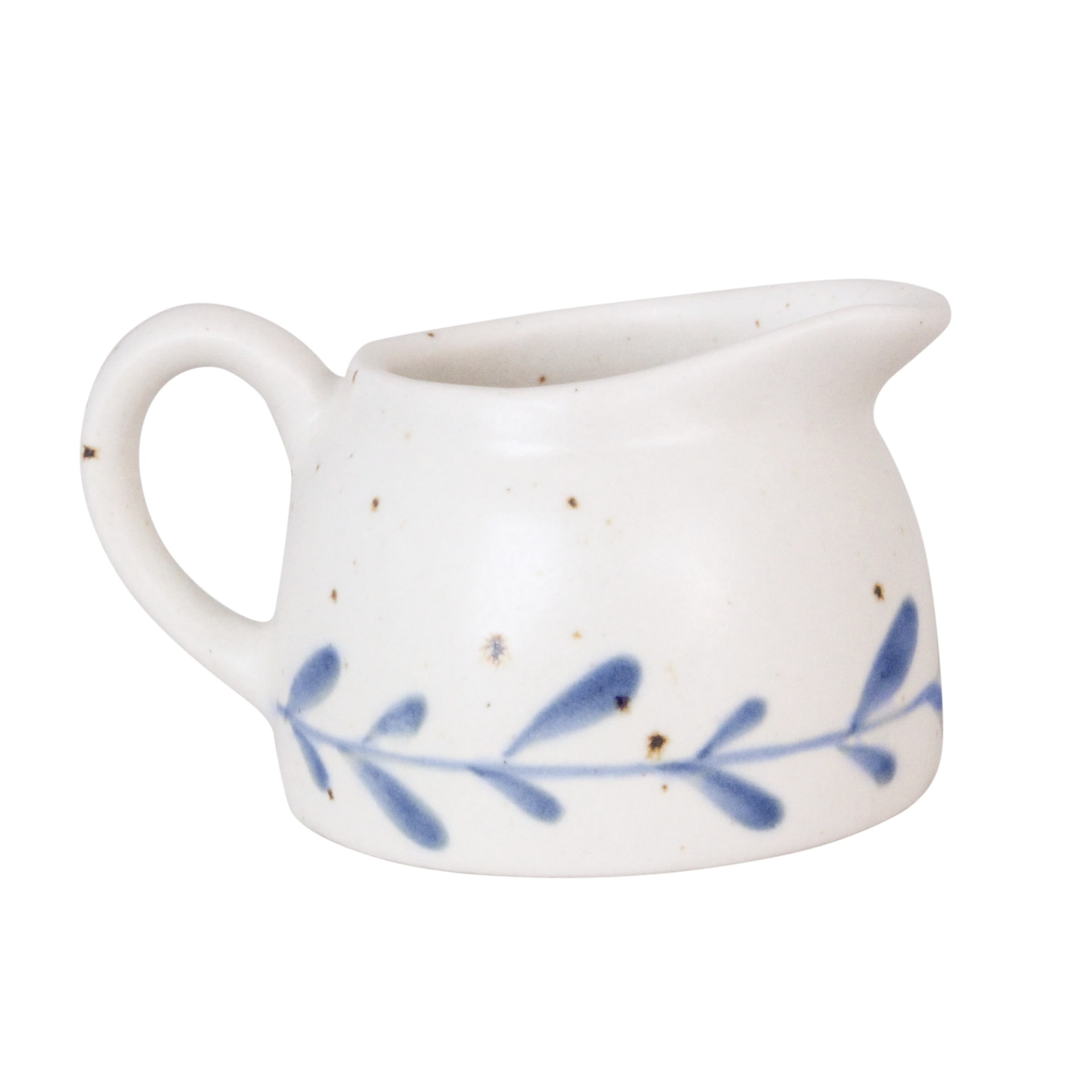 Má rukoväť a praktický lievik na bezpečné podávanie mlieka alebo smotany.Kamenina navyše umožňuje vyniknúť drobnému posypovému vzoru, ktorého intenzita sa mení v závislosti od teploty výpalu, spolu s ručne maľovanou vetvičkou modrých listov. Každý džbán je tak úplne unikátny.