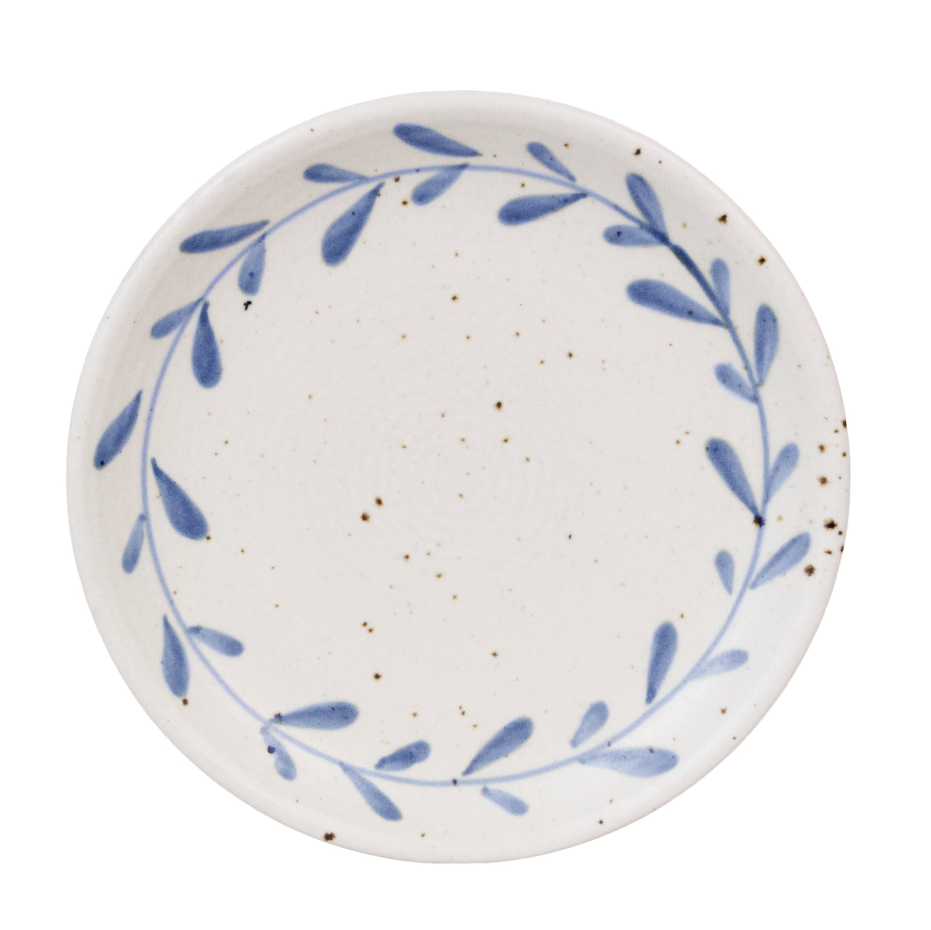 Má tlmený biely odtieň a kamenina navyše necháva vyniknúť drobnému sypanému vzoru, ktorého intenzita sa mení v závislosti od teploty výpalu, spolu s ručne maľovanou vetvičkou s modrými lístkami. Každý tanier je tak úplne jedinečný.