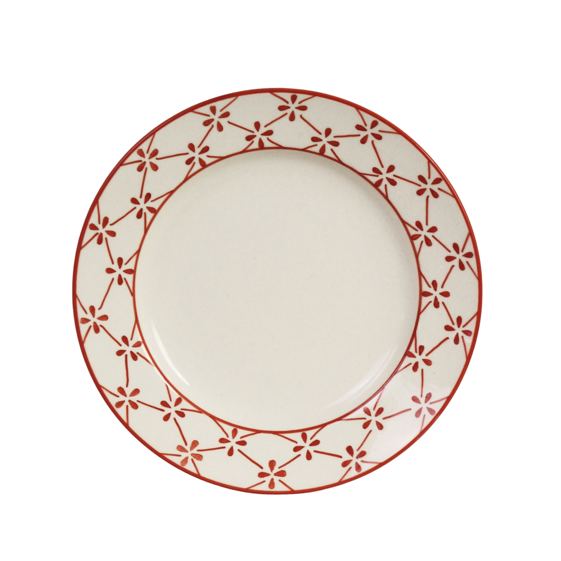 Vneste na svoj stôl hrejivý dotyk francúzskeho vidieka s týmto keramickým tanierom zdobeným ručne maľovaným motívom ďatelinových lístkov v teplom červenom odtieni.