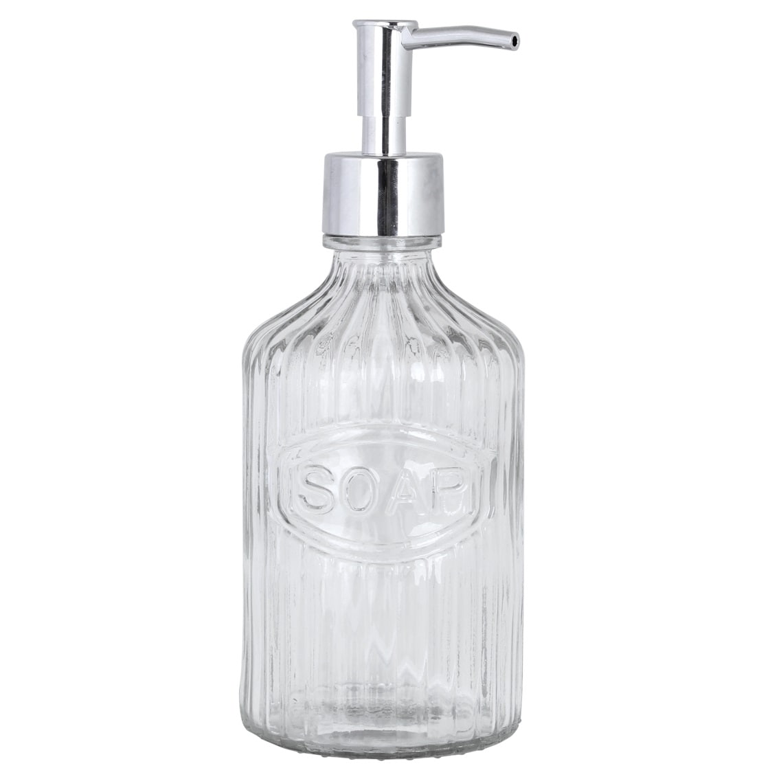 Dávkovač je vyrobený z číreho skla a je zdobený jemnými zúbkami po celom povrchu. Tie doplňuje tiež nápis Soap, ktorý je však decentne nenápadný. Pumpička je strieborná, plastová, a skvele vám poslúži pri každom umývaní rúk. Naplňte dávkovač obľúbeným mydlom a užite si nový nádych, ktorý vašej kúpeľni dodá! priemer 8 cm / výška 19,5 cm Vyrobené zo skla a plastu.