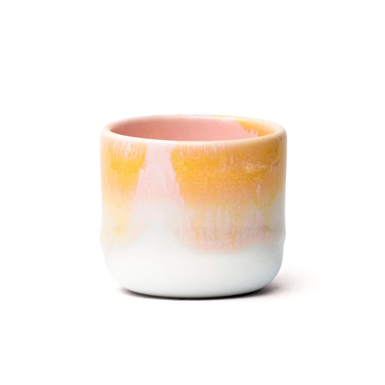 Drobná porcelánová šálka, ktorá príjemne padne do ruky a premení každý dúšok, sústo alebo moment na malý rituál. Šálka je ručne odlievaná a pokrytá reaktívnou glazúrou, ktorá na každom kuse vytvára úplne jedinečný dekor.