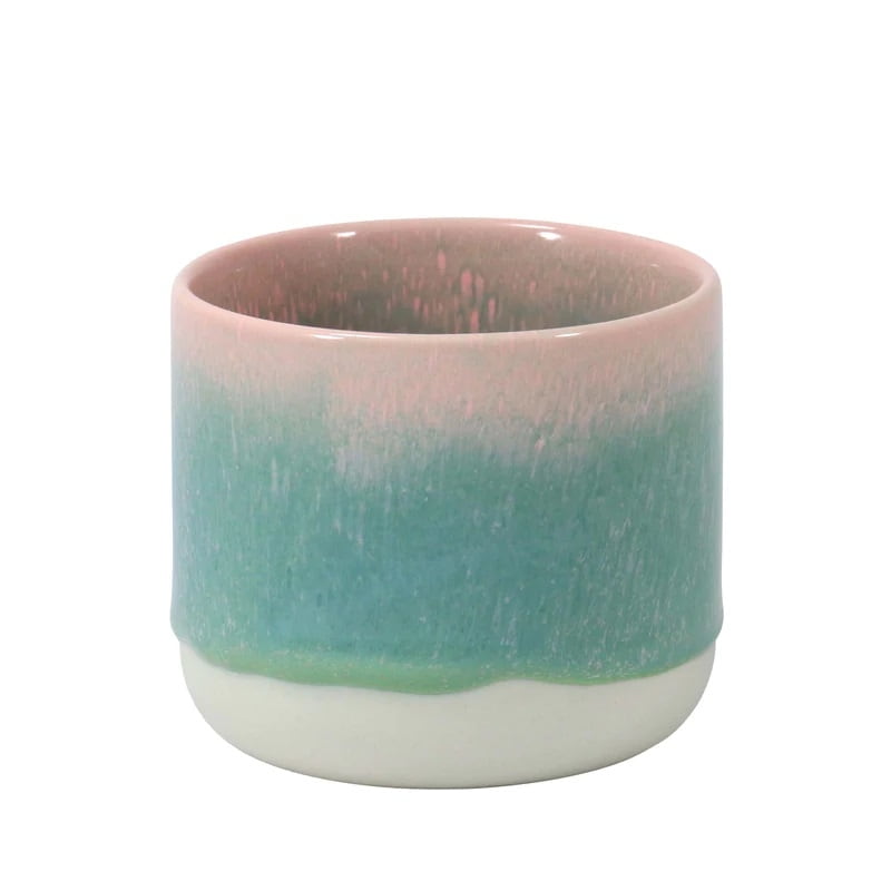 Šálke Rose Leaf dominuje mätovo zelený odtieň prechádzajúci do sladkej ružovej. Glazúra je hrubšia v mieste, kde sa stretáva s keramikou, a vytvára dojem, že steká po stene.