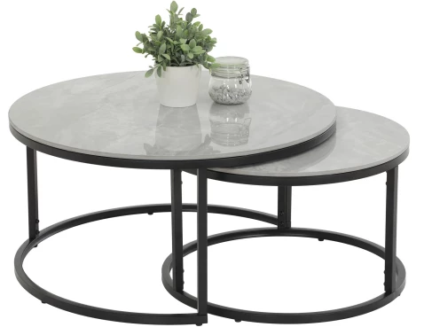 Súprava 2 kusov okrúhlych stolíkov s priemerom 80 cm a 60 cm má moderný dizajn a prakticky do seba zapadajú. Stolíky sú vyrobené v imitácii šedého mramoru v kombinácii s čiernou kovovou konštrukciou. Stolíky je možné využiť ako spoločnú kompozíciu alebo samostatne - väčší stolík umiestnite k sedačke a menší stolík napríklad vedľa sedačky na odkladanie vecí, prípadne je možné stolíky zasunúť do seba - záleží ich na vás.