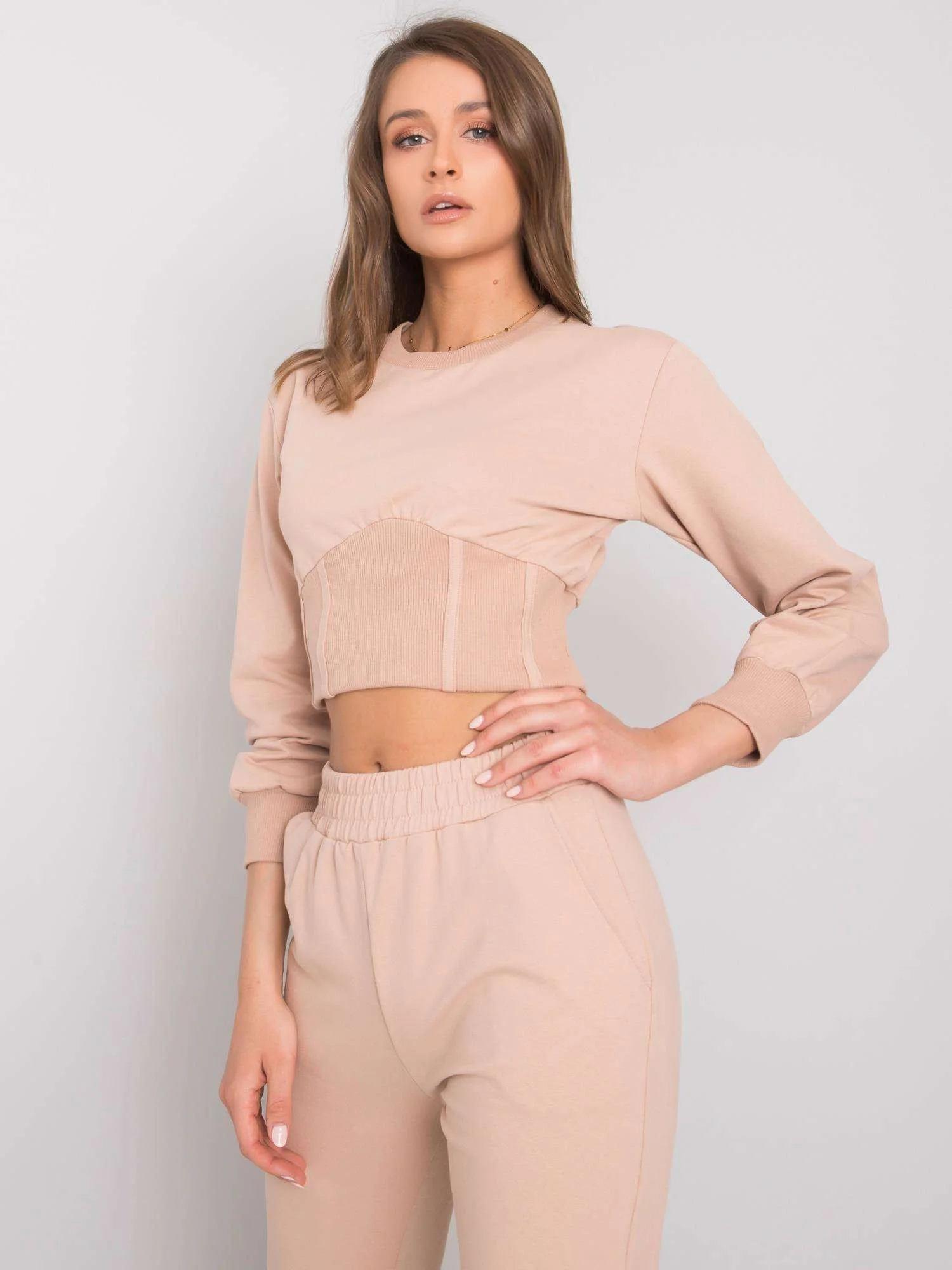 RUE PARIS Béžová dámska tepláková sú prava. Súprava obsahuje: nohavice, mikinu zloženie látky: 100% bavlna spôsob prania: pranie v práčke na 30 °C Modelka má na sebe veľkosť S. Rozmery modelky: výška 176 cm, prsia 85 cm, pás 64 cm, boky 92 cm. Rozmery súpravy vo veľkosti S merané na plocho: šírka v podpazuší - 45 cm, dĺžka blúzky - 40 cm, dĺžka rukávov - 53 cm, šírka v páse - 34 cm, dĺžka nohavíc - 96 cm Veľkosť Alt.Výška Obvod hrudníka hrudník Externé. dĺžka. rukáv Vnútorné. dĺžka rukávov S 36 160-164 82 59 49 M 38 162-172 86 61 51 L 40 164-174 91 63 53