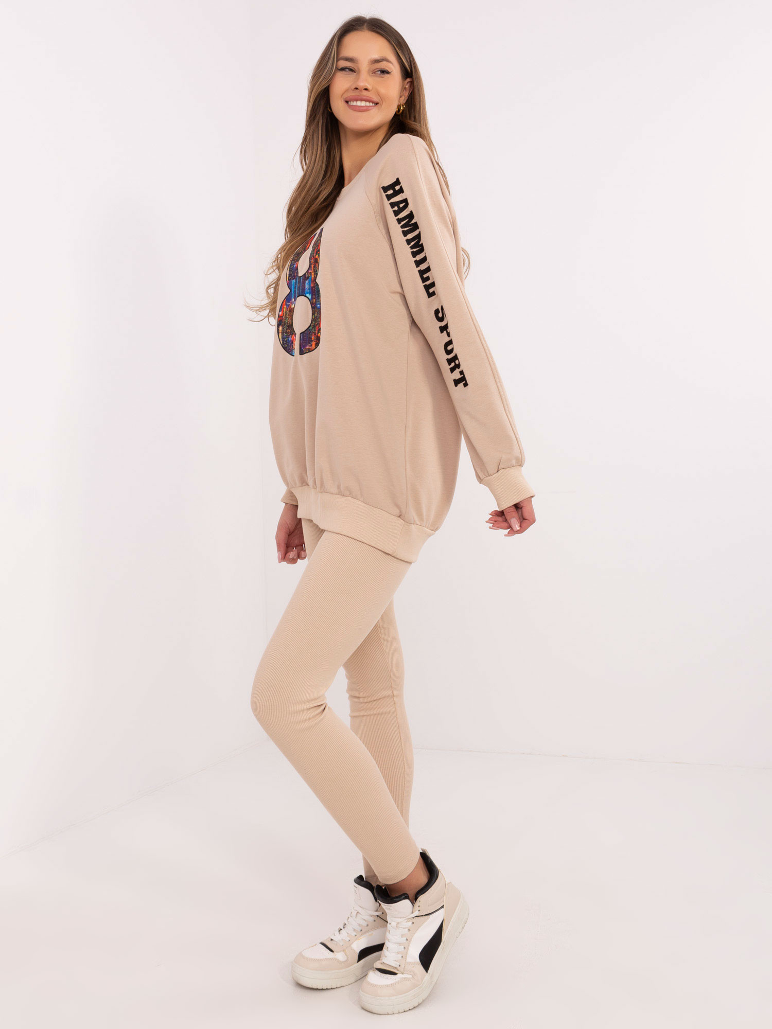 materiál blúzky: 72 % bavlna, 22 % polyester, 6 % elastan; materiál legín: 90 % bavlna, 10 % elastan Modelka má na sebe jednu veľkosť. miery modelky: výška 176 cm, prsia 90 cm, pás 62 cm, boky 94 cm. Rozmery jednej veľkosti mikiny merané na plocho: šírka mikiny v podpazuší - 62 cm, dĺžka mikiny - 74 cm, dĺžka rukávov - 43 cm (od podpazušia), obvod v oblasti bokov - 110 cm. Rozmery legín jednej veľkosti: šírka v páse - 29 cm (na plocho), šírka v páse - 48 cm (po natiahnutí), dĺžka legín - 101 cm.