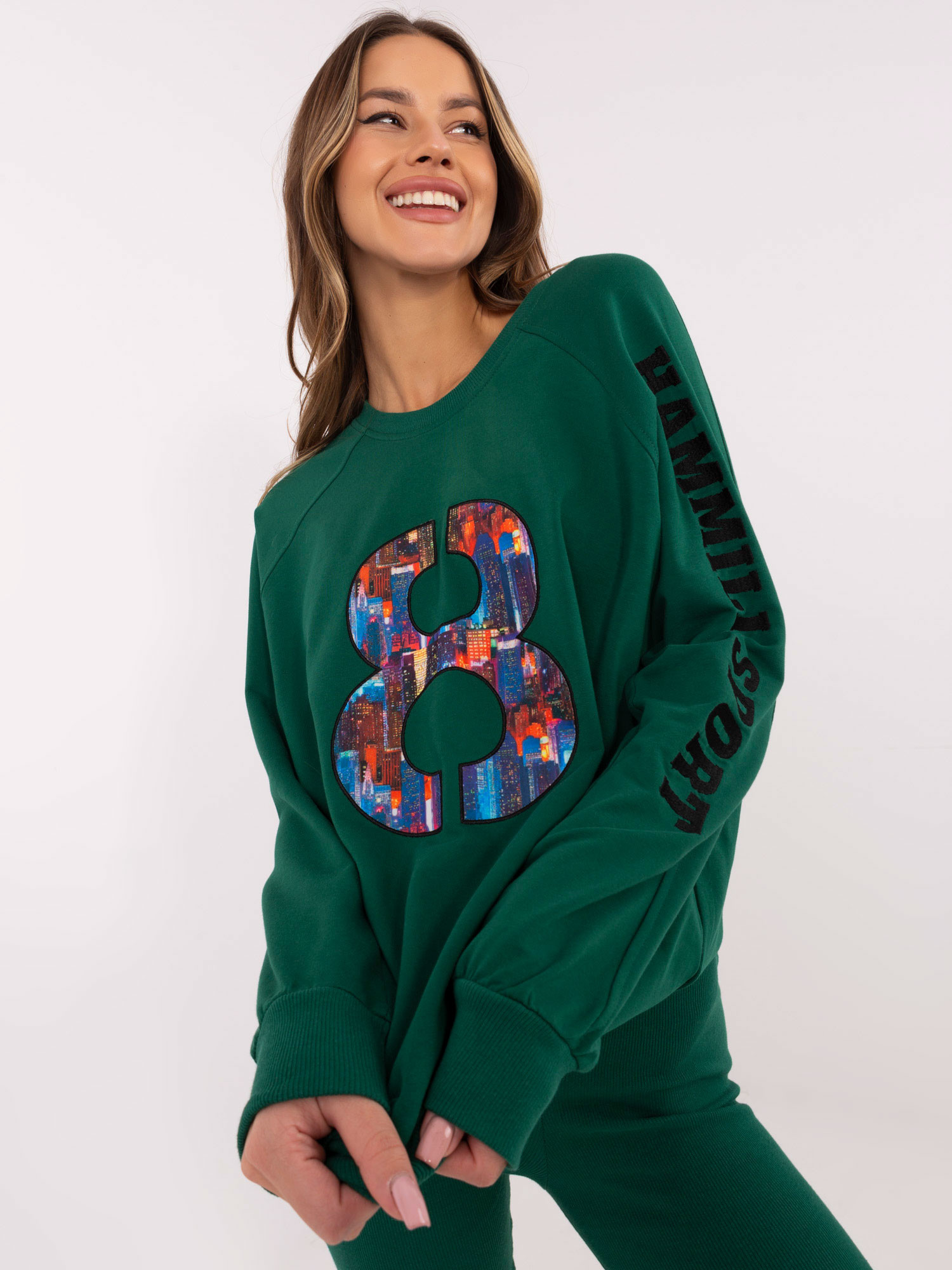 materiál blúzky: 72 % bavlna, 22 % polyester, 6 % elastan; materiál legín: 90 % bavlna, 10 % elastan Modelka má na sebe jednu veľkosť. miery modelky: výška 176 cm, prsia 90 cm, pás 62 cm, boky 94 cm. Rozmery jednej veľkosti mikiny merané na plocho: šírka mikiny v podpazuší - 62 cm, dĺžka mikiny - 74 cm, dĺžka rukávov - 43 cm (od podpazušia), obvod v oblasti bokov - 110 cm. Rozmery legín jednej veľkosti: šírka v páse - 29 cm (na plocho), šírka v páse - 48 cm (po natiahnutí), dĺžka legín - 101 cm.