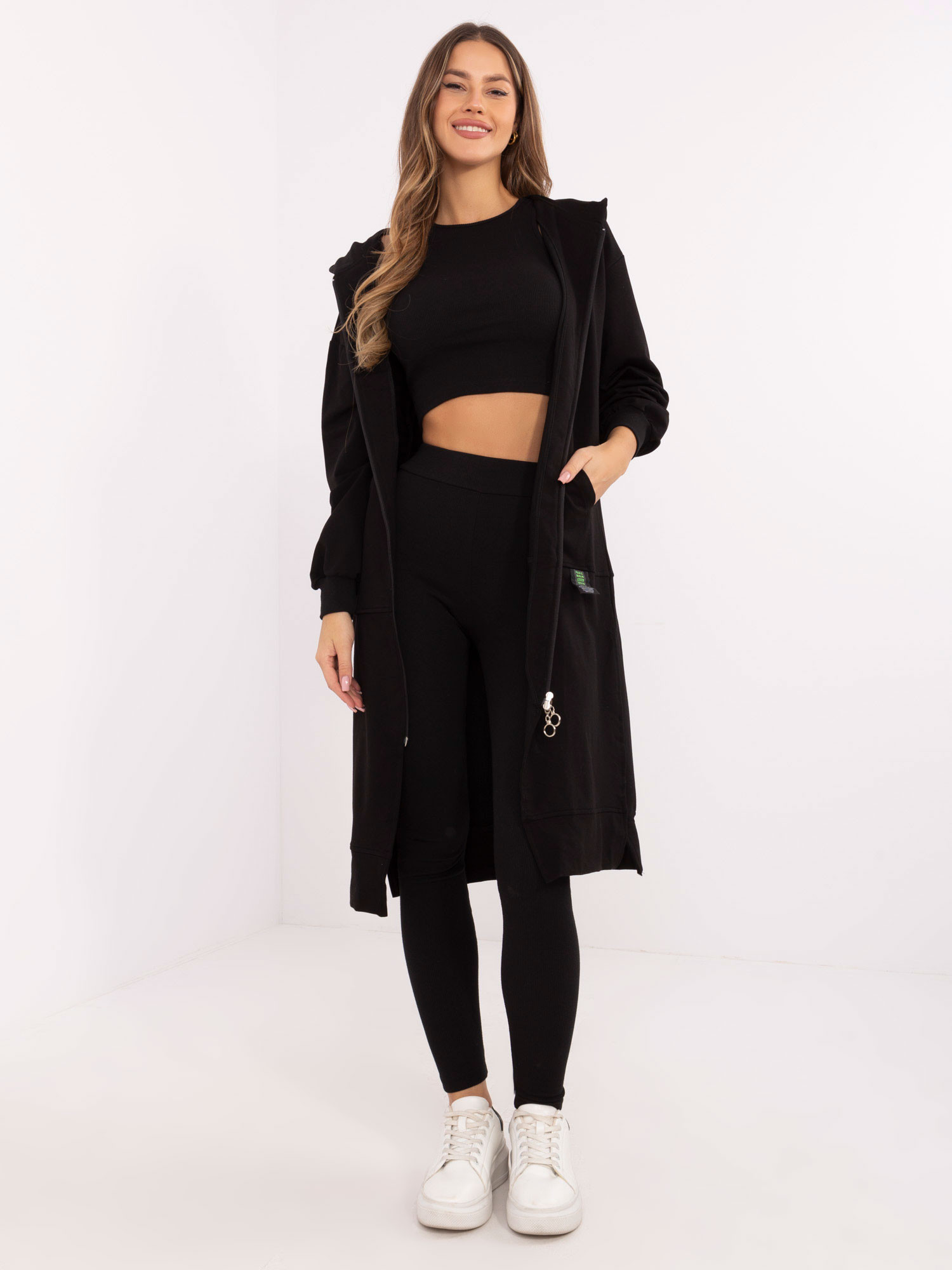 materiálové zloženie blúzky: 72 % bavlna, 22 % polyester, 6 % elastan; materiálové zloženie legín a topu: 90 % bavlna, 10 % elastan Modelka má na sebe jednu veľkosť. miery modelky: výška 176 cm, prsia 90 cm, pás 62 cm, boky 94 cm. Rozmery topu v jednej veľkosti merané na plocho: šírka topu v podpazuší - 57 cm, dĺžka topu - 107 cm, dĺžka rukávov - 52 cm, obvod v oblasti bokov - 108 cm. Rozmery topu v jednej veľkosti: šírka topu v podpazuší - 30 cm (na plocho), šírka topu v podpazuší - 65 cm (po natiahnutí), dĺžka topu - 41 cm (strečový materiál). Rozmery legín v jednej veľkosti: šírka v páse - 30 cm (na plocho), šírka v páse - 62 cm (po natiahnutí), dĺžka legín - 100 cm (strečový materiál).
