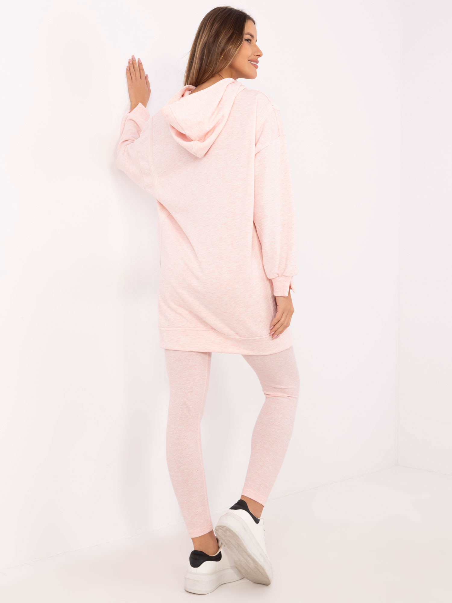 materiál blúzky: 70% bavlna, 30% polyester; materiál legín: 90% bavlna, 10% elastan Modelka má na sebe jednu veľkosť. miery modelky: výška 176 cm, prsia 90 cm, pás 62 cm, boky 94 cm. Rozmery mikiny v jednej veľkosti merané na plocho: šírka mikiny v podpazuší - 64 cm, dĺžka mikiny - 75 cm (vpredu), dĺžka mikiny - 83 cm (vzadu), dĺžka rukávov - 48 cm (od švu), obvod v oblasti bokov - 124 cm. Rozmery legín v jednej veľkosti: šírka v páse - 29 cm (na plocho), šírka v páse - 54 cm (po natiahnutí), dĺžka legín - 100 cm (strečový materiál).