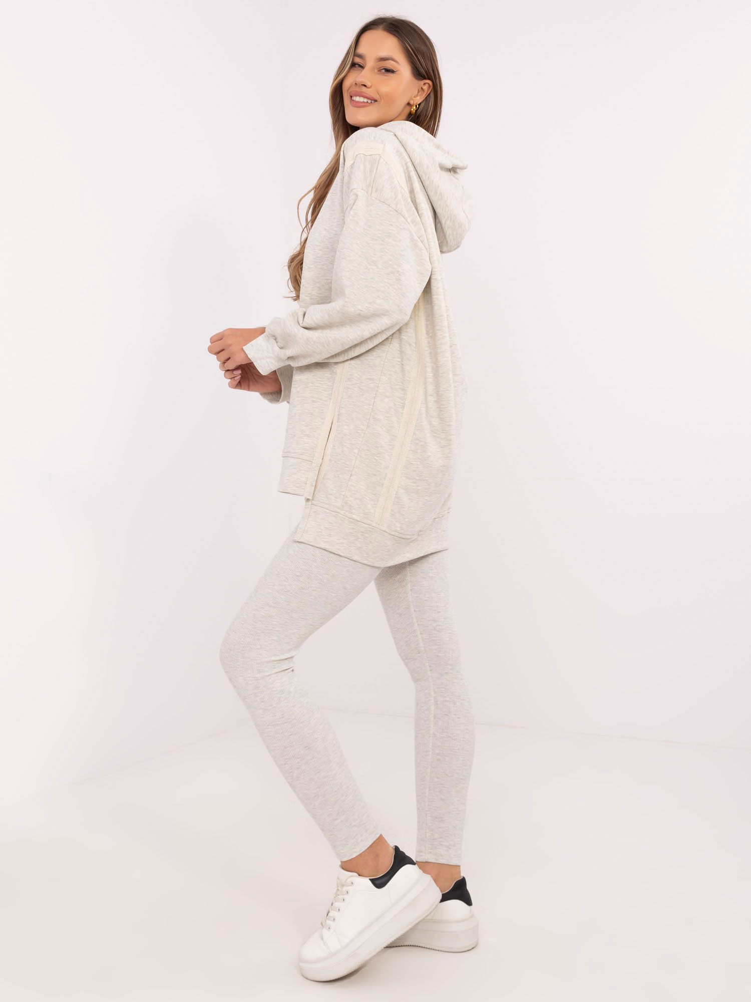 materiál blúzky: 70% bavlna, 30% polyester; materiál legín: 90% bavlna, 10% elastan Modelka má na sebe jednu veľkosť. miery modelky: výška 176 cm, prsia 90 cm, pás 62 cm, boky 94 cm. Rozmery mikiny v jednej veľkosti merané na plocho: šírka mikiny v podpazuší - 64 cm, dĺžka mikiny - 75 cm (vpredu), dĺžka mikiny - 83 cm (vzadu), dĺžka rukávov - 48 cm (od švu), obvod v oblasti bokov - 124 cm. Rozmery legín v jednej veľkosti: šírka v páse - 29 cm (na plocho), šírka v páse - 54 cm (po natiahnutí), dĺžka legín - 100 cm (strečový materiál).