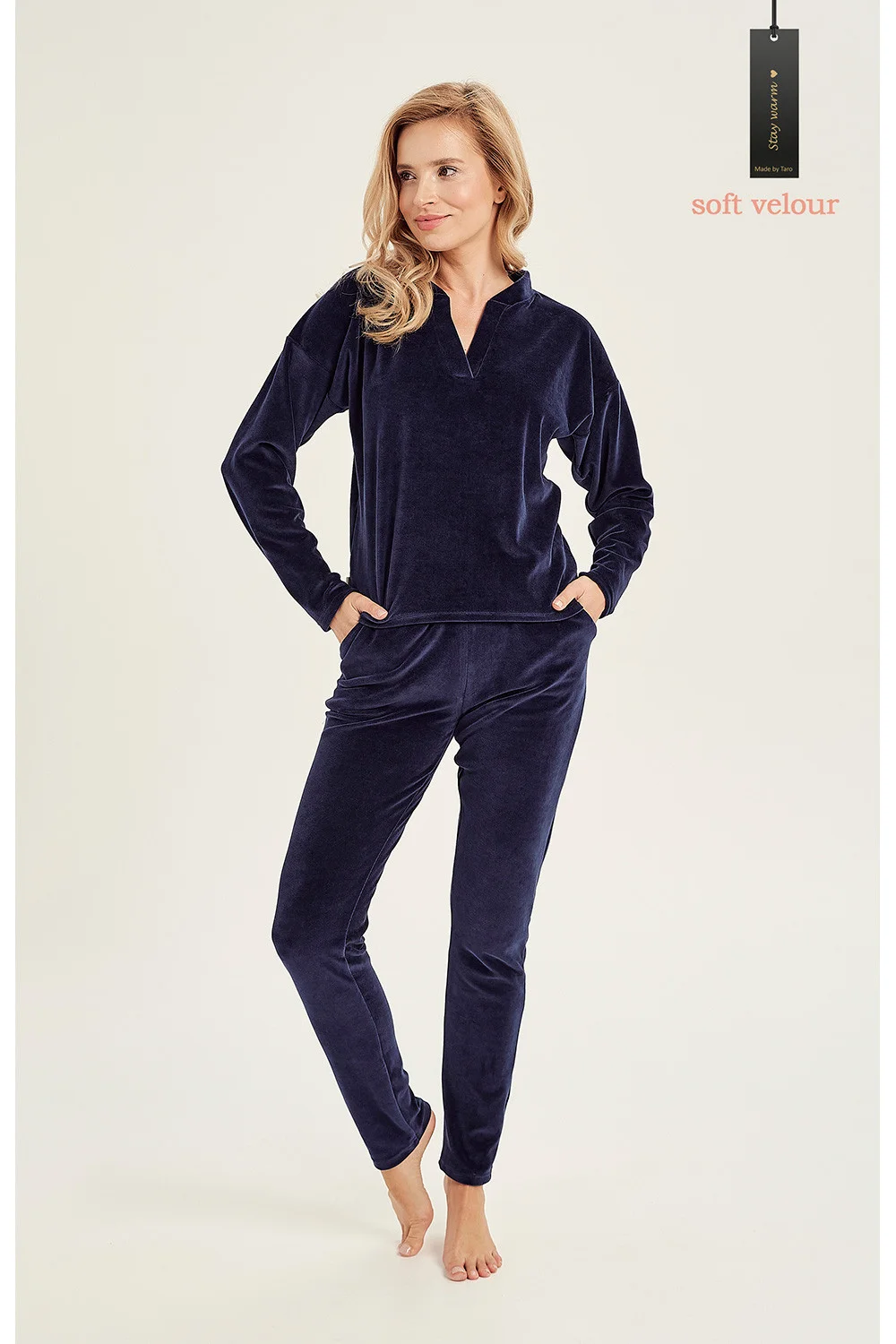 Dámska tepláková súprava z hrejivého velúru. Blúzka s dlhými rukávmi, stojatým golierom a výrazným rozparkom v tvare písmena V. Dlhé nohavice s praktickými vreckami na bokoch, pohodlná guma v páse. Ideálne ako športové oblečenie alebo súčasť každodenného oblečenia. Tepláková súprava je ľahká, priedušná a zároveň hrejivá. bavlna 80% Polyester 20% Veľkosť Obvod bokov Obvod hrudníka L102-106 cm96-100 cmM96-100 cm90-94 cmS88-92 cm84-88 cmXL108-112 cm102-106 cm