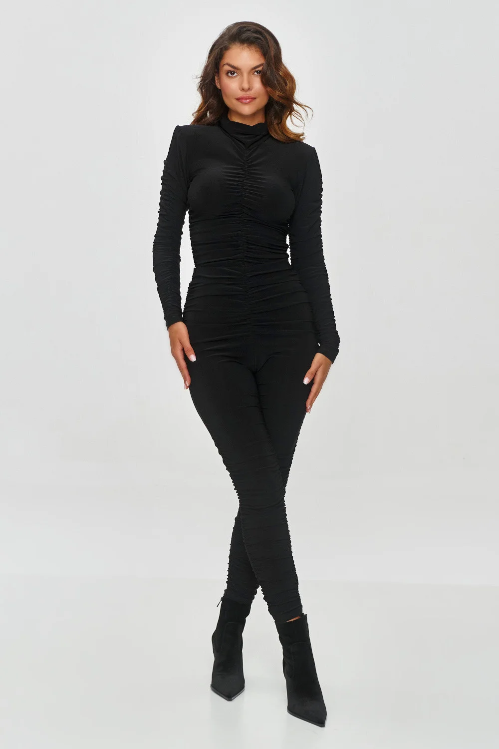 Elegantný čierny komplet s elegantným, priliehavým strihom. Blúzka má dlhé rukávy a vysoký výstrih, čo dodáva celému vzhľadu sofistikovaný a bohatý vzhľad. Prechodný šev vpredu a vzadu vytvára záhyby, ktoré dodávajú textúru a účinne modelujú postavu. Nohavice sú zúžené, čím zdôrazňujú priliehavý vzhľad a moderný štýl. Hladký materiál s miernym leskom dodáva lesk a hodí sa kedykoľvek a kdekoľvek. Strih tohto modelu zdôrazňuje pás a dodáva celému outfitu zmyselnosť. Dámsky komplet, prispôsobený tvaru postavy, vyvolá tie najtajnejšie rezervy sexappealu a sebavedomia. Skvelý pre odvážne ženy a skutočné módne nadšenkyne. elastan 6 %Polyester 94 % Veľkosť DĺžkaObvod bokov Obvod cez prsia Obvod pása 3444/84 cm68 cm72 cm68 cm3646/84 cm72 cm76 cm72 cm3848/84 cm76 cm80 cm76 cm4050/84 cm80 cm84 cm80 cm