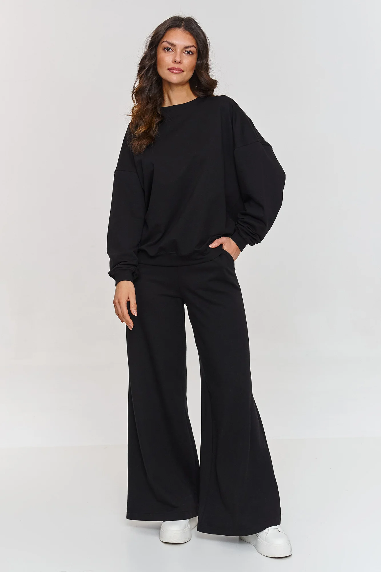 Tento teplák je ideální volbou pro ženy, které ocení funkčnost a styl. Sada se skládá z oversized mikiny s dlouhými rukávy a volných kalhot, které vytvářejí pohodlný, ale stylový celek. Díky širokému střihu kalhoty poskytují plnou volnost pohybu a elastický pas se přizpůsobuje postavě. Navíc jsou rozšiřovány ke dnu, což dává sadě výjimečný a dynamický charakter. Mikina s klasickým kulatým výstřihem a rukávy s pružnými lemy doplňují celek, vytvářejí pohodlnou a zajímavou sadu. Tepláky jsou vyrobeny z měkkého a příjemného materiálu, který zajišťuje pohodlí každý den. Díky jednoduchému, ale efektnímu střihu se sada skvěle hodí do různých situací. Naše tepláková sada spojuje volnost, funkčnost a moderní vzhled. Hodí se jak na odpočinek doma, tak na setkání s přáteli, nákupy nebo do každodenního života. Sada skvěle ladí s oblíbenými teniskami, vytvářející stylové, pohodlné a módní outfit. bavlna 95 % Elastan 5 % Veľkosť DĺžkaObvod bokov Obvod cez prsia Obvod pása 3664/102 cm92 cm124 cm88 cm3866/104 cm96 cm128 cm92 cm4068/106 cm100 cm132 cm96 cm
