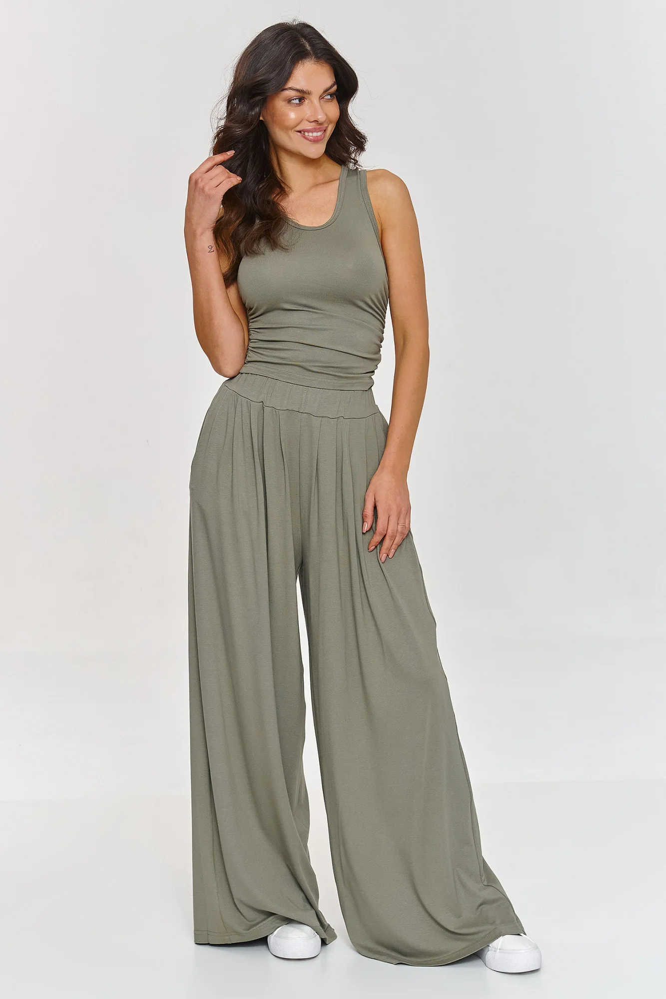 Volný dámský set je ideální nabídkou pro ženy, které hledají spojení pohodlí s elegancí. Součástí setu je přizpůsobený top s ramínky, který je navíc zdoben záhyby na bocích, a široké kalhoty s vysokým pasem, které společně vytvářejí módní a pohodlnou stylizaci. Vyrobený z lehké, prodyšné viskózy je tento set skvělý na teplé dny, poskytující pocit volnosti po celý den. Set je jednoduchý, ale efektní, kombinuje pohodlí s moderním vzhledem. Můžete ho nosit jak na každý den, tak na méně formální setkání. Skvěle ladí s bílými teniskami nebo sandály, vytvářející ležérní vzhled, ale stejně dobře se hodí k elegantnějším doplňkům. Nepopiratelnou výhodou tohoto setu je materiál, který se vyznačuje skvělou prodyšností, což z něj činí příjemný k nošení, i po dlouhé hodiny. Náš viskózový set je letní nabídkou spojující stylový design s pohodlím. Skvěle se hodí jak do práce, na společenská setkání, tak i na rela elastan 5% Viskóza 95% Veľkosť DĺžkaObvod pása Obvod cez prsia Obvod pása 3648/108 cm96 cm64 cm84 cm3850/108 cm100 cm68 cm88 cm4052/108 cm104 cm72 cm92 cm4254/108 cm108 cm76 cm96 cm