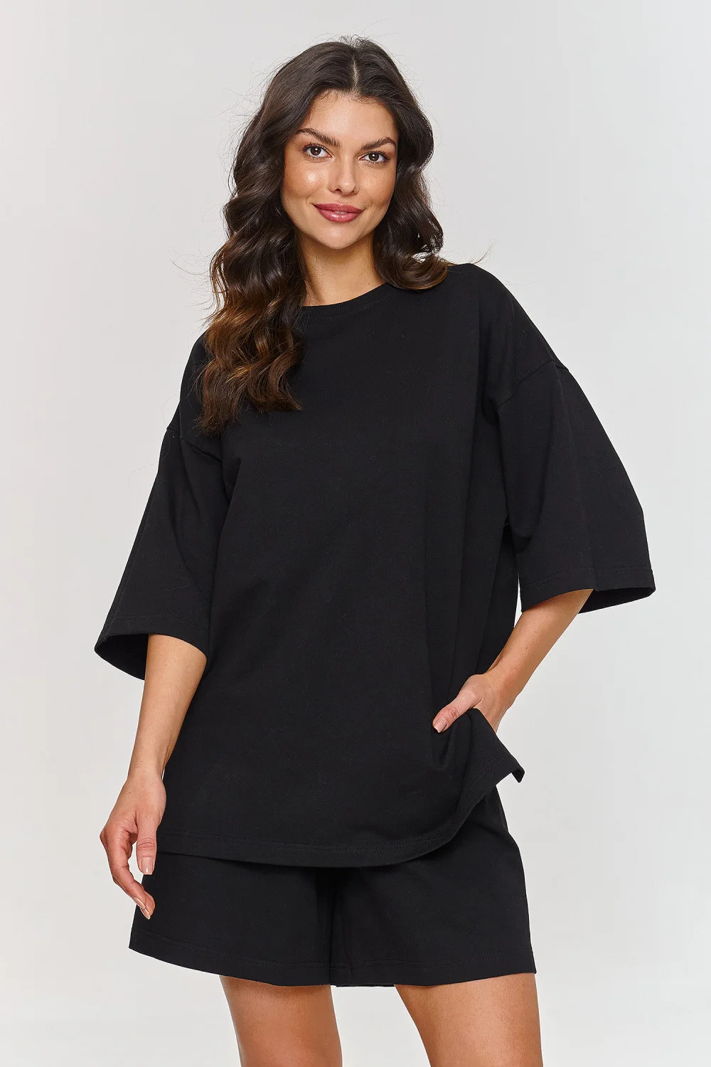 Tento pohodlný teplákový set je ideálním řešením pro ženy, které ocení pohodlí a nadčasovost ve svých každodenních stylizacích. Přesný střih trička zaručuje plnou volnost pohybu a módní vzhled. Krátký rukáv a klasický kulatý výstřih z něj činí ideální nezávaznou základnu pro každodenní stylizace. Kraťasy mají elastický pas, co zajišťuje správné přizpůsobení a boční kapsy zdůrazňují jejich funkčnost. Volný střih kalhot a široké nohavice zaručují plnou volnost pohybů a kratší délka je ideální pro teplé dny. Jednoduchý, ale efektní teplákový set spojuje minimalistický design s pohodlím a vytváří skvělou volbu pro každodenní stylizace. Je to must-have pro relaxaci doma, setkání s přáteli nebo krátké výlety. Jeho univerzálnost však umožňuje také využití při různých fyzických aktivitách. bavlna 95% Elastan 5% Veľkosť DĺžkaObvod pása Obvod hrudníka Obvod pása 3668/42 cm100 cm112 cm84 cm3870/44 cm104 cm116 cm88 cm4072/46 cm108 cm120 cm92 cm4274/48 cm112 cm124 cm96 cm