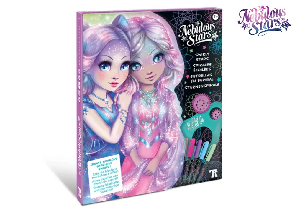 Súprava Nebulous Stars Paint Star Spirals Nebulous Stars Sada na maľovanie hviezdnych špirál. Obsah balenia - 48 čiernych strán, šablóna špirály a 7 koliesok, 6 neónových gélových pier, strana so samolepkami. 36 strán má ilustrácie, ktoré môžete vyfarbiť a doplniť špirály.