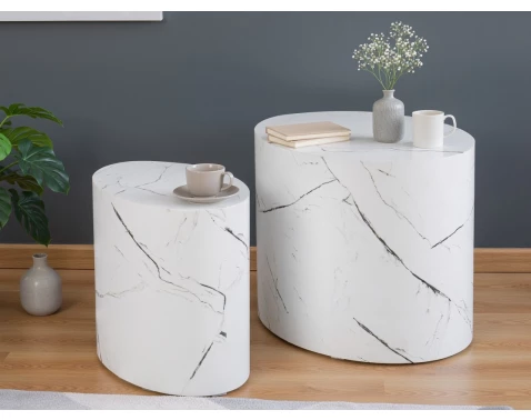 Súprava 2 kusov rôzne veľkých stolíkov v trendovom oválnom tvare je vyrobená v imitácii bieleho mramoru,v modernom interiéri bude tvoriť atraktívnu kompozíciu.