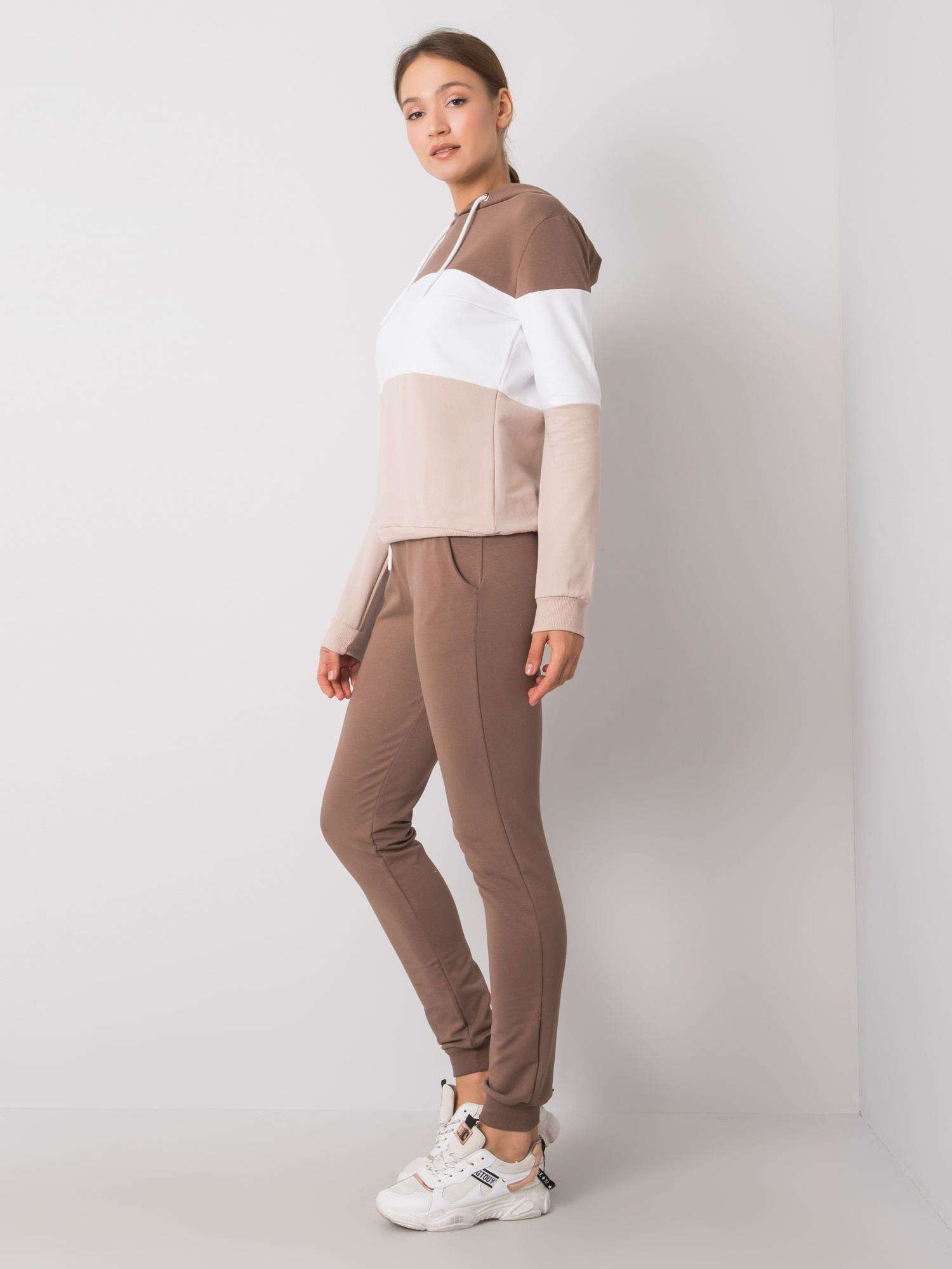 Hnedá a béžová tepláková súprava. súprava obsahuje: mikinu, nohavice zloženie materiálu: 90 % bavlna, 10 % elastan spôsob prania: pranie v práčke pri 30 °C Modelka má na sebe veľkosť S/M. Rozmery modelky: výška 180 cm, hrudník 89 cm, pás 63 cm, boky 93 cm. Rozmery súpravy vo veľkosti S/M merané na plocho: šírka v podpazuší - 49 cm, dĺžka blúzky - 60 cm, dĺžka rukávov - 61 cm, šírka v páse - 35 cm, dĺžka nohavíc - 95 cm Veľkosť Alt. Výška Obvod hrudníka Hrudník Vonkajšia dĺžka. rukáv Vnútorná dĺžka rukáva S/M 36/38 160-172 82-86 59-61 49-51 L/XL 40/42 164-178 91-96 63-65 53-55