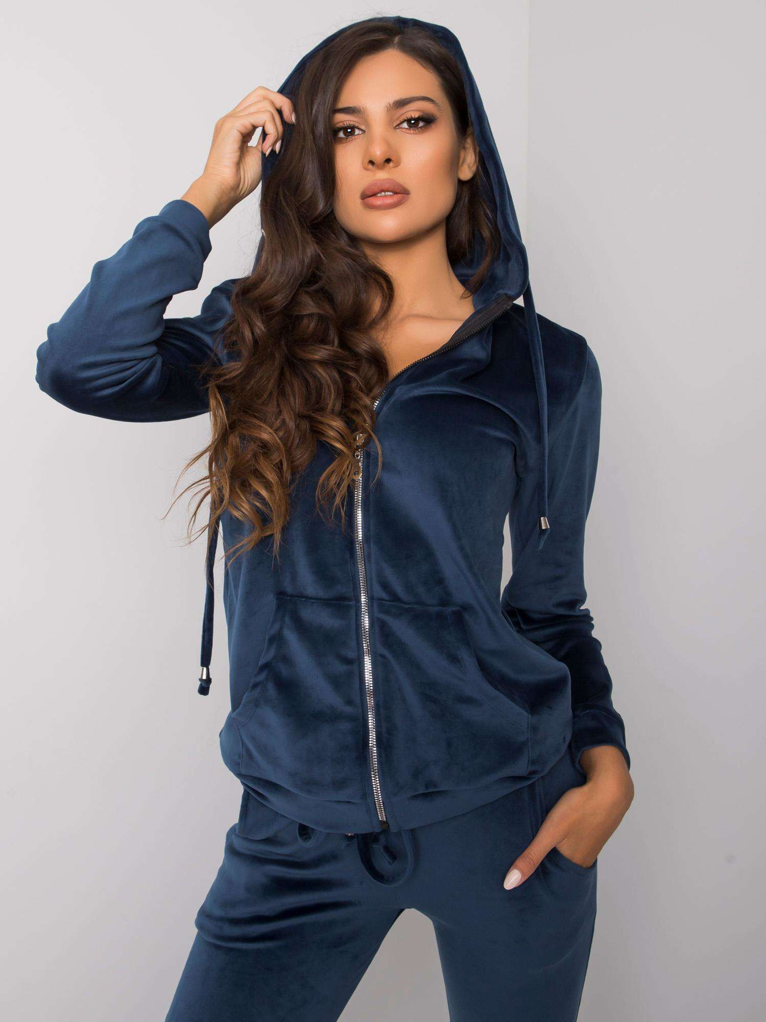 RUE PARIS Tmavomodrá velúrová súprava pre ženy. súprava obsahuje: nohavice, blúzku zloženie materiálu: 90 % viskóza, 10 % elastan spôsob prania: pranie v práčke pri 30 °C Modelka má na sebe veľkosť S. Miery modelky: výška 176 cm, prsia 86 cm, pás 60 cm, boky 88 cm. Rozmery súpravy vo veľkosti S merané na plocho: šírka v podpazuší - 47 cm, dĺžka blúzky - 61 cm, dĺžka rukávov - 57 cm, šírka v páse - 35 cm, dĺžka nohavíc - 94 cmVeľkosť alt.VýškaObvod hrudníkaVonkajšia dĺžka rukávovVonkajšia dĺžka rukávovS36160-164825949M38162-172866151L40164-174916353XL42166-178966555