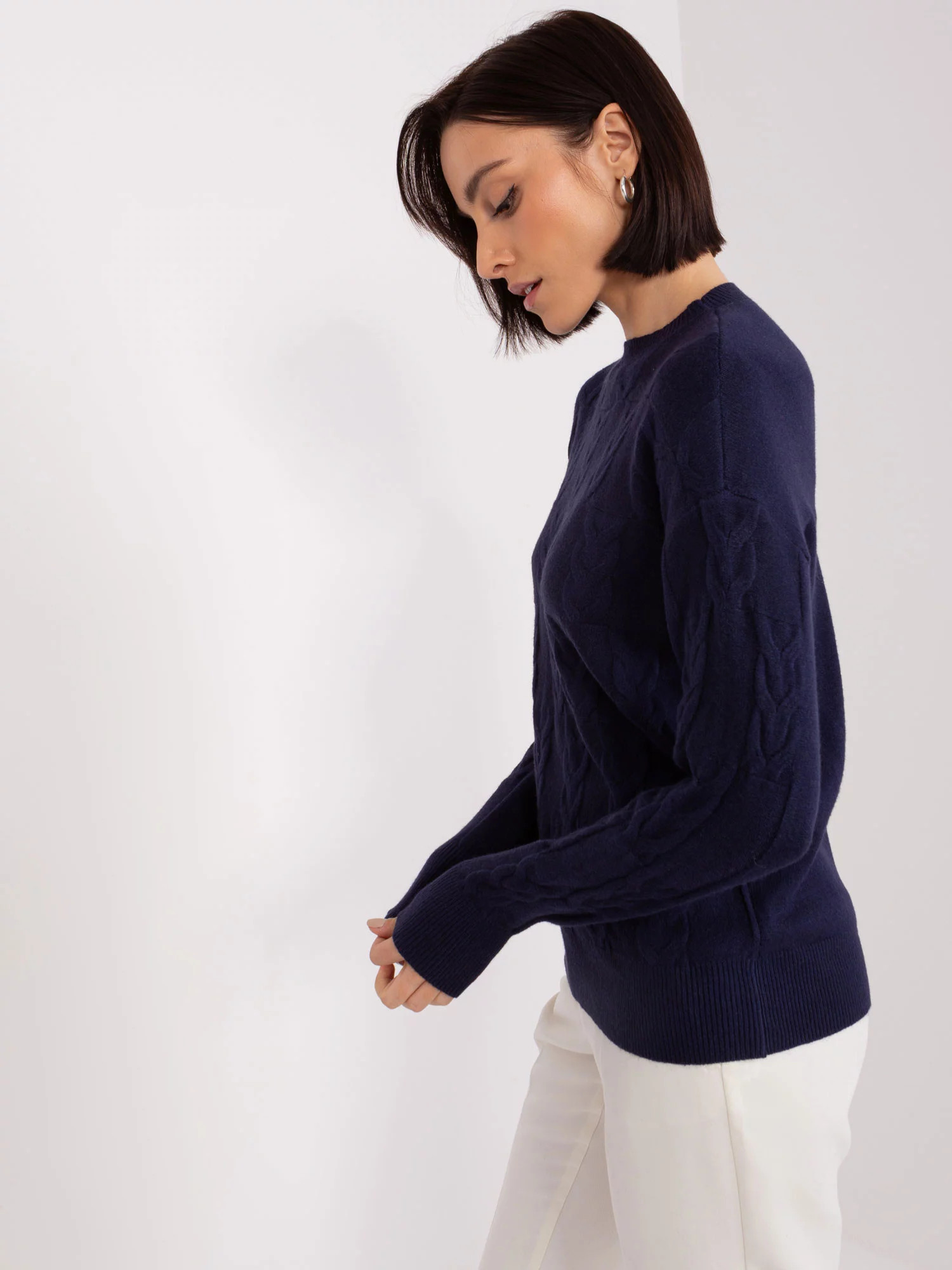 Námornícky modrý kockovaný sveter voľného strihu. kód produktu: AT-SW-2340.80 dominantný vzor: pestrá štruktúra tkaniny štýl: ležérny príležitosť: ležérny, do mesta, na prechádzku Modelka má na sebe jednu veľkosť. Rozmery modelky: výška 178 cm, prsia 90 cm, pás 62 cm, boky 94 cm. Rozmery svetra v jednej veľkosti merané na plocho: šírka v podpazuší - 50 cm, celková dĺžka - 63 cm, dĺžka rukáva - 63 cm.