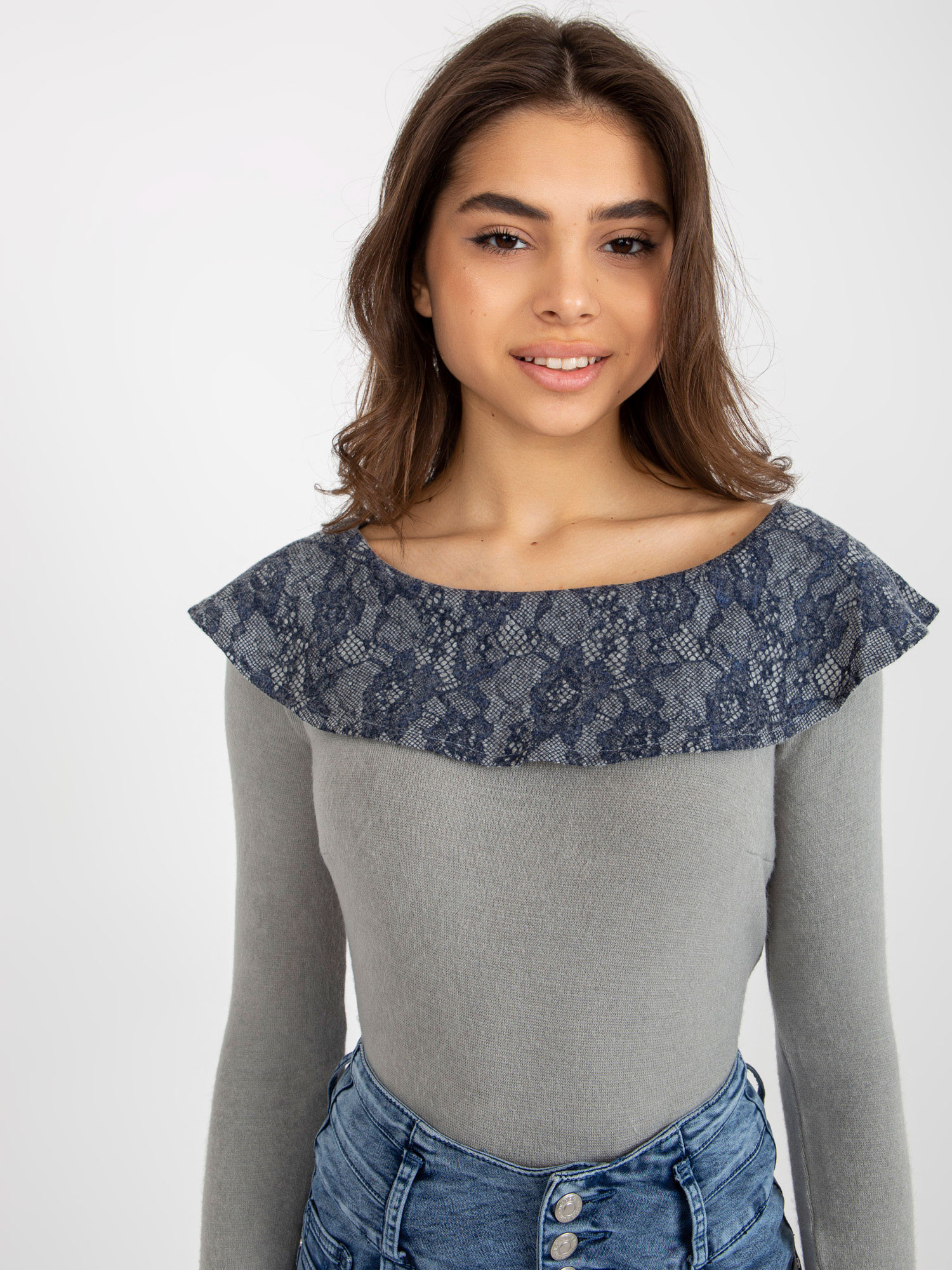 Šedomodrá blúzka s lodičkovým výstrihom a šnurovacím golierom. kód produktu: LK-SW-506559-2.13 dominantný vzor: hladký štýl: vintage príležitosť: ležérna, do práce, do mesta, na rande Modelka má na sebe veľkosť 36. Miery modelky: výška 172 cm, prsia 88 cm, pás 61 cm, boky 92 cm. Rozmery svetra vo veľkosti 36 merané na plocho: šírka v podpazuší - 38 cm, dĺžka rukáva - 52 cm, celková dĺžka - 48 cm.Veľkosť alt.VýškaObvod hrudníkaVonkajšia dĺžka rukávaVonkajšia dĺžka rukáva36S160-16882594938M162-17286615140L164-17491635342XL166-178966555