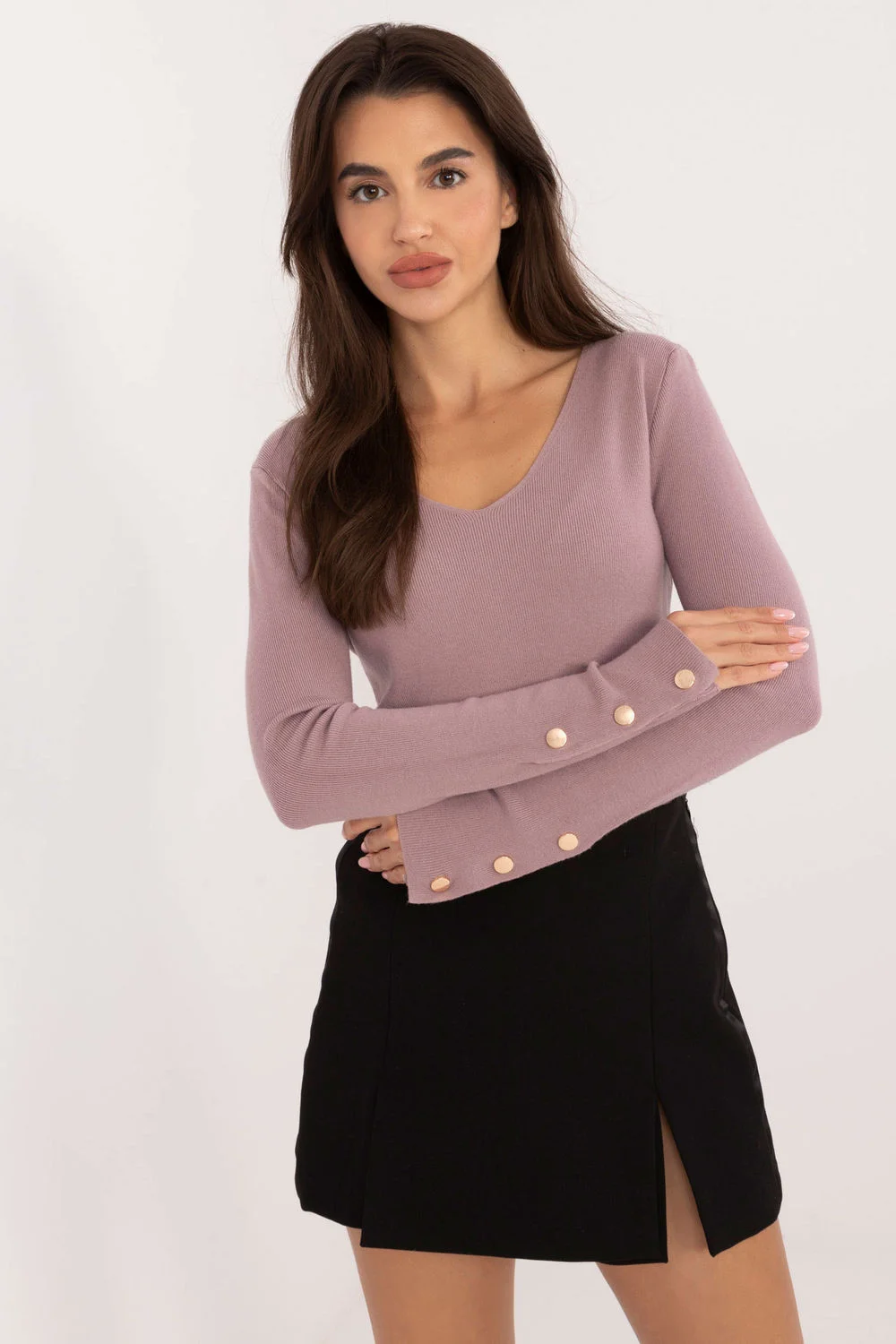 Tento dámsky sveter voľného strihu je ideálny na každodenné nosenie a do práce. Je vyrobený z kvalitnej zmesi viskózy, polyamidu a polyesteru, čo zaručuje pohodlie a odolnosť. Hladký vzor a klasická dĺžka robia z tohto svetra univerzálny kúsok oblečenia. Sveter má dlhé rukávy ukončené ozdobnými gombíkmi na zápästí, ktoré dodávajú jemný elegantný akcent. Výstrih do V zvýrazňuje krk a dodáva celému kúsku ženský nádych. Skvelá voľba do kancelárie aj na každodenné nosenie. polyamid 22%Polyester 29% Viskóza 49% Veľkosť Vnútorná dĺžka rukávov Vonkajšia dĺžka rukávov Obvod cez prsia L/XL53-55 cm63-65 cm91-96 cmS/M49-51 cm59-61 cm82-86 cm