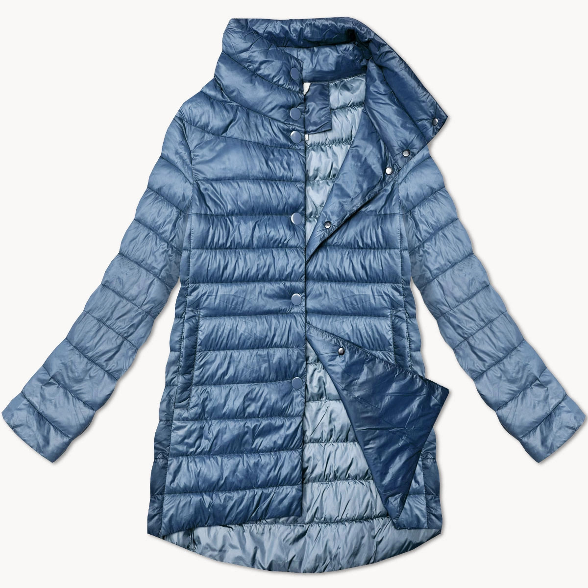 Pri výbere veľkosti venujte pozornosť nižšie uvedenej veľkostnej tabuľke. Veľkosti nezodpovedajú bežne nosenému oblečeniu. Tenká bunda so stojačikom Bunda je ľahko zateplená vrstvou syntetickej páperovej výplne, má dve vrecká bez zapínania a zapína sa na patentky. Model sa smerom nadol rozširuje. Zadná časť je o niečo dlhšia ako predná. Dĺžka prednej časti bundy siaha po boky a dĺžka zadnej časti siaha do polovice stehien. Materiál: 100 % polyester.
