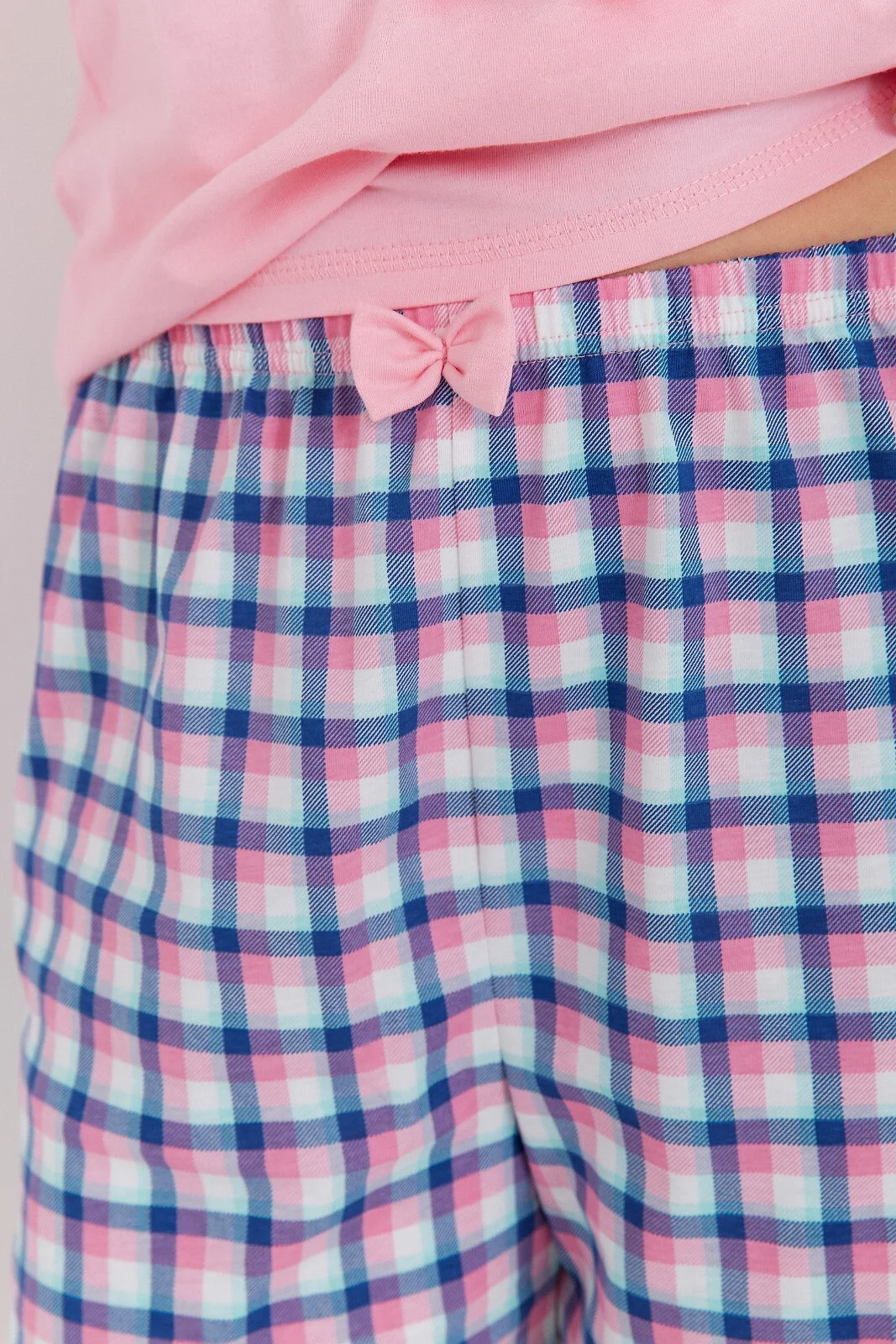 Dámske letné pyžamo - jednofarebná košeľa s krátkym rukávom - výstrih do V - krátke šortky s kockovaným vzorom - voľný, pohodlný strih - elastický pás s ozdobnou mašľou 100% bavlna