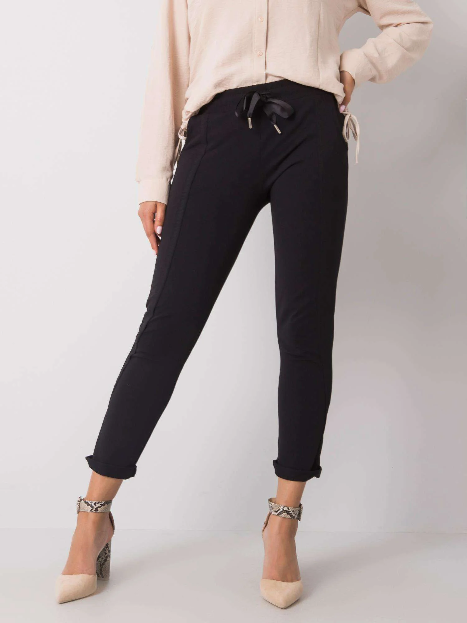 Čierne dámske tepláky. zloženie látky: 90% bavlna, 10% elastan spôsob prania: pranie v práčke na 30 °C Modelka má na sebe veľkosť S. Rozmery modelky: výška 174 cm, prsia 82 cm, pás 67 cm, boky 95 cm. Veľkosť nohavíc S merané na plocho: šírka v páse - 36 cm, celková dĺžka - 90 cm, výška v páse - 28 cm Medzinárodná veľkosť Výška Obvod pása Obvod bokov Vonkajšia dĺžka nohavíc Dĺžka vnútornej nohavice S 36 160-168 72-80 90 87 74 M 38 162-172 78-86 94 90 75 L 40 164-174 84-90 102 94 76 XL 42 166-178 88-96 106 98 77
