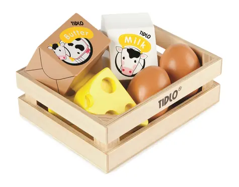 Tidlo Drevená debnička s mliečnymi výrobkami a vajcami