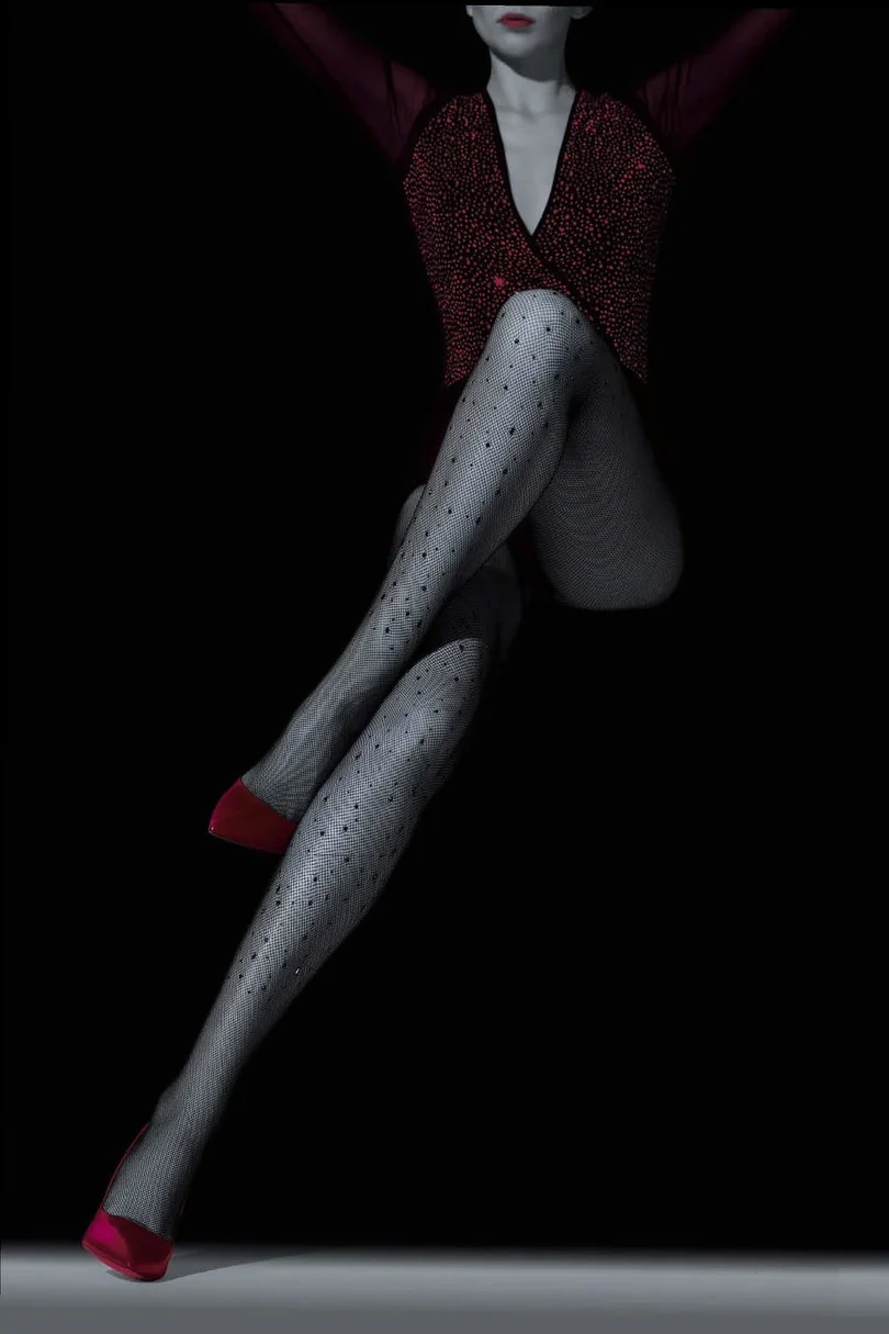 Dámske kabaretné pančuchové nohavice s malými očkami.Zdobené čiernymi lesklými kamienkami.Majú plochý šev a bavlnený klin.Nemajú zosilnenie na špičkách.