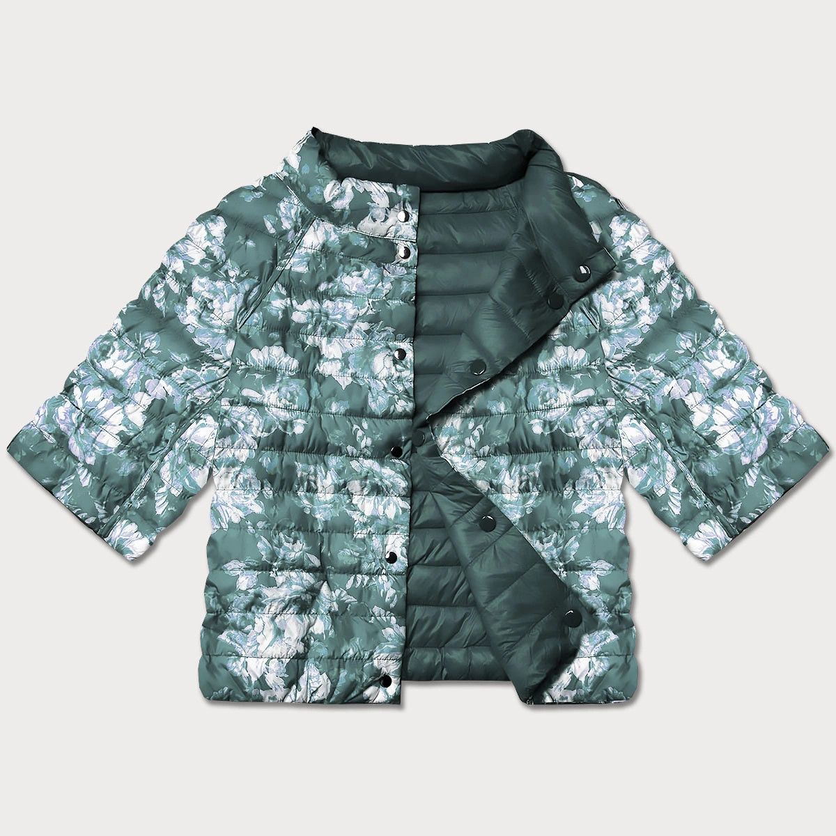 Domov Oblečenie a móda Dámske oblečenie Dámske bundy a kabáty Tmavo mätová/florálna obojstranná dámska bunda plus size s 3/4 rukávmi Minority (M23-7010-253) odstíny zelené 50