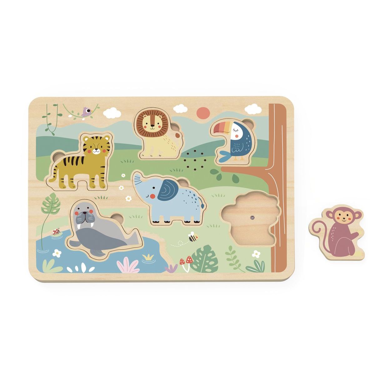 Exotické zvieratká sú námetom pre drevenú vkladačku.