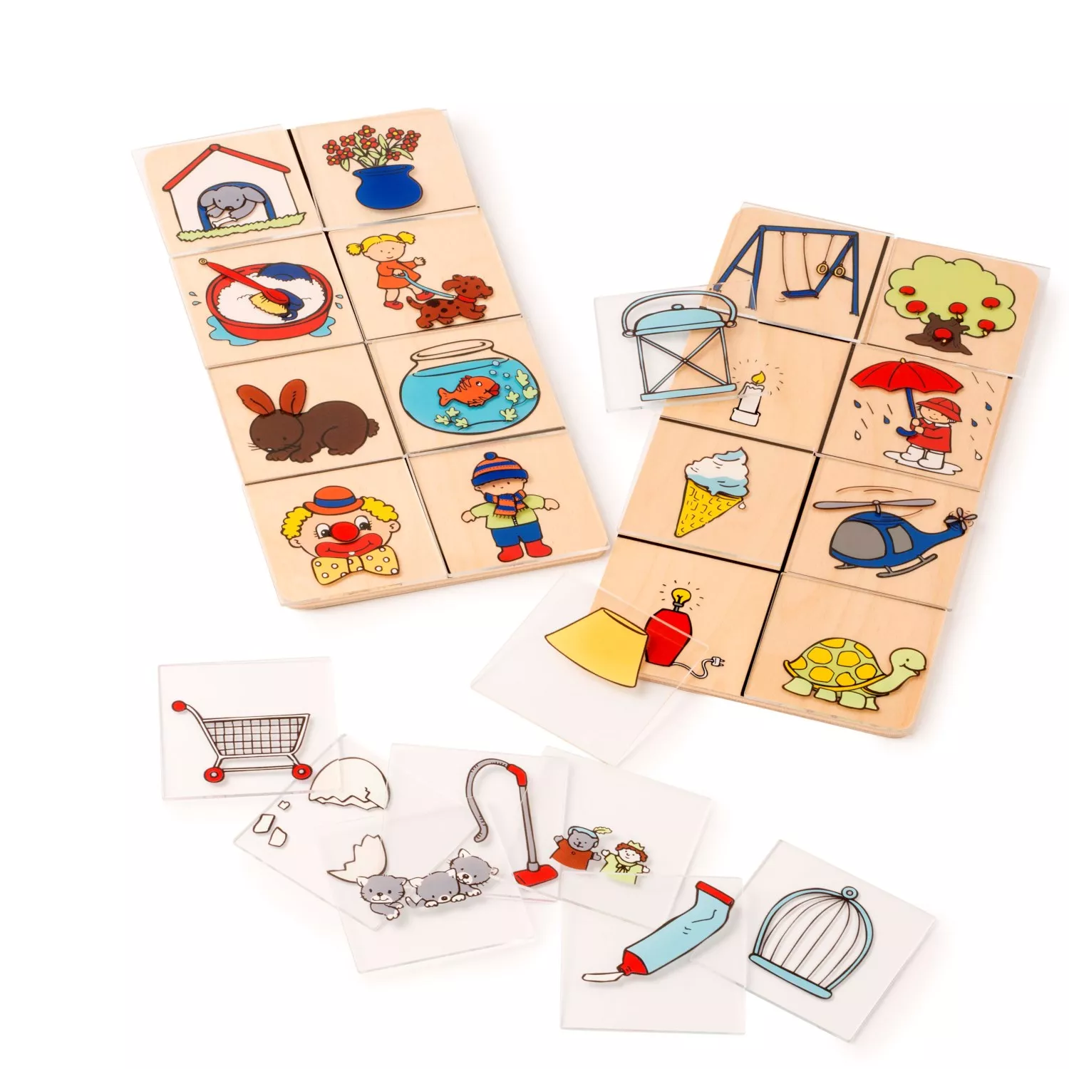 Deti priraďujú priehľadné kartičky k dreveným obrázkom tak, aby zodpovedali zadaniu v obrázku. Hra rozvíja schopnosť popisovať, porovnávať a hodnotiť, či výsledný obrázok dáva zmysel. Aktivita podporuje komunikáciu a systematické premýšľanie.