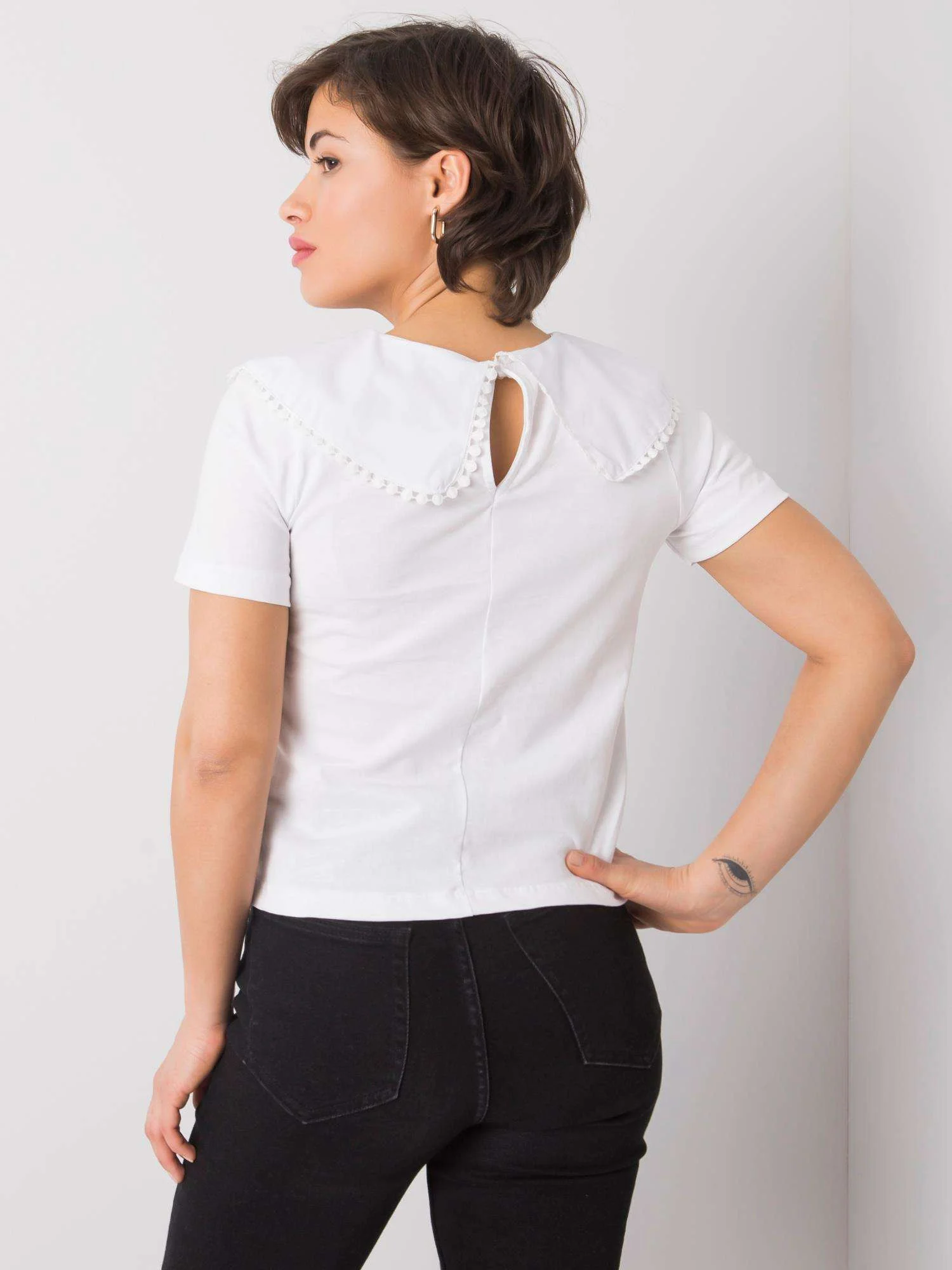 RUE PARIS Dámska biela blúzka s golierom . zloženie látky: 100% bavlna spôsob prania: pranie v práčke na 30 °C Modelka má na sebe veľkosť S. Rozmery modelky: výška 160 cm, poprsie 87 cm, pás 59 cm, boky 89 cm. Rozmery blúzky vo veľkosti S merané na plocho: šírka v podpazuší - 40 cm, celková dĺžka - 45 cm Veľkosť Alt.Výška Obvod hrudníka hrudník Externé. dĺžka. rukáv Vnútorné. dĺžka rukávov S 36 160-164 82 59 49 M 38 162-172 86 61 51 L 40 164-174 91 63 53