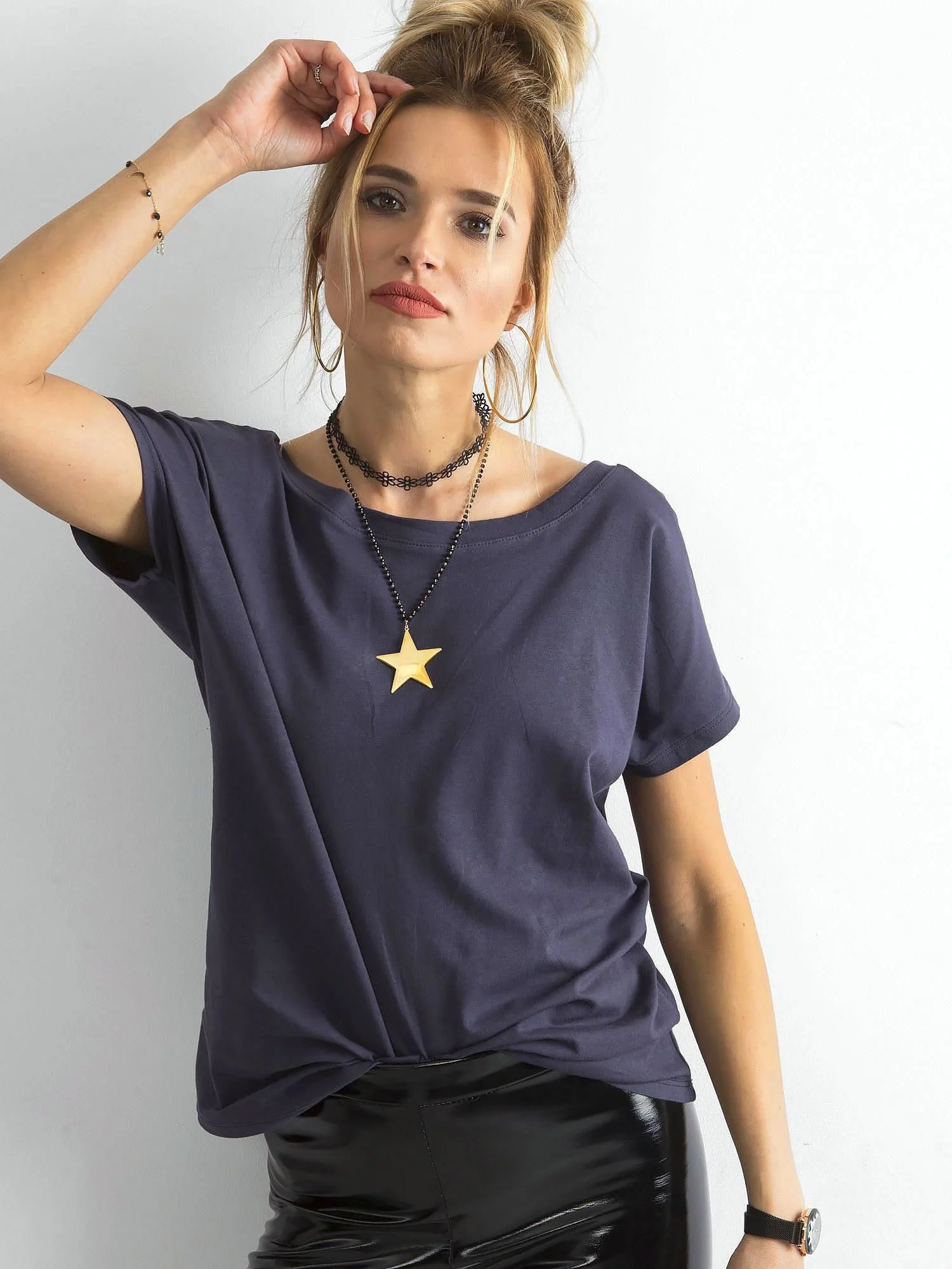 Grafitowy t-shirt Fire. Gładkich koszulek w szafie nigdy dość! Zgadzasz się z tym stwierdzeniem? Jeśli tak to uzupełnij już teraz swoją szafę o wyjątkową kolekcję wygodnych t-shirtów basic dostępnych w supermodnych kolorach i wyjątkowym fasonie. Ten model został wykonany z przyjemnych w dotyku i miękkich materiałów, które zapewniają wysoki komfort noszenia oraz odpowiednią wentylację skóry. Będziesz czuła się w nim bosko, ponieważ ma on wygodny dekolt oraz dodatkowe trójkątne wcięcie na plecach, które doda wyjątkowości każdej codziennej stylizacji. Sprawia, to że oferowany t-shirt basic prezentuje się jednocześnie uniwersalnie i bardzo kobieco, co kochają w szczególności panie lubiące ubierać się z klasą. Wygoda jeszcze nigdy nie szła w parze z aż takim szykiem - zobacz całą kolekcję modnych koszulek Fire z naszego sklepu online i uzupełnij swoją szafę! Do wyboru czeka mnóstwo modnych i niepowtarzalnych kolorów, które sprawdzą się nie tylko na ciepłeT-shirty z naszej flagowej serii Fire wyraźnie wyróżniają się krojem spośród większości klasycznych koszulek. Będziesz wiedziała o co chodzi, jeśli przyjrzysz się temu modelowi z tyłu - od razu w oczy rzuca się piękne trójkątne wycięcie na plecach, które dodaje kobiecości każdej stylizacji. Koszulka wykonana jest z bardzo przyjemnego w dotyku materiału, który zawiera dużo bawełny, dzięki czemu zapewnia jednocześnie przewiewność i jest przyjazny w kontakcie ze skórą. T-shirt ma ponadto luźniejszy fason, który ładnie opływa sylwetkę i sprytnie tuszuje mniejsze mankamenty sylwetki, a także klasyczne krótkie rękawy oraz kobiecy dekolt z przodu. Tak stylowa koszulka basic aż się prosi o zestawienie jej z modnymi jeansami lub szortami z naszej najnowszej kolekcji online. Pasują do niej zarówno buty na obcasie, jak i płaskie obuwie sportowe, dlatego bez problemu stworzysz z jej pomocą zestawy w stylu casualowym oraz nieco bardziej eleganckim. Przekonaj się o tym jak ciezloženie tkaniny: 90 % bavlna, 10 % elastanspôsob prania: pranie v práčke pri 30 °CModelka má na sebe veľkosť S. Rozmery modelky: výška 175 cm, prsia 84 cm, pás 65 cm, boky 92 cm.Rozmery trička vo veľkosti S merané na plocho: šírka v podpazuší - 56 cm, celková dĺžka - 67 cm