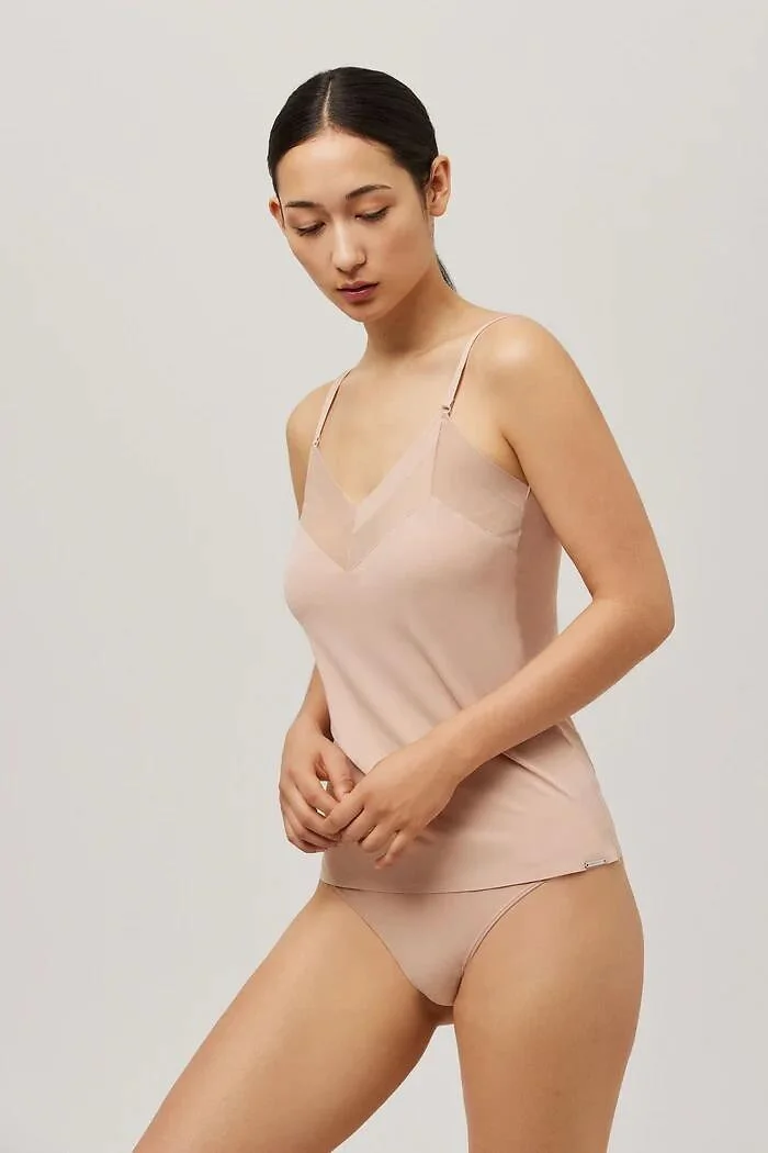 Dámske tričko - hladké mikrovlákno so saténovým leskom - nastaviteľné elastické ramienka - pútavý výstrih z priehľadnej sieťoviny - diskrétne, nenápadné lemy - balené v škatuli Zloženie: 90 % polyamid, 10 % elastan