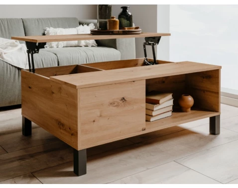 Tento konferenčný stolík v dekore dub artisan ,prekvapí svojou praktickosťou. Pod výklopnou hornou plochou nájdete vnútorné úložné priestory, kam ľahko uschováte veci každodennej potreby, prípadne knižky alebo časopisy. Oceníte aj otvorenú odkladaciu priehradku z bočnej strany stolíka, do ktorej budete odkladať napríklad diaľkové ovládače. S týmto stolíkom tak budete mať všetko prehľadne uložené na rovnakom mieste a zároveň vždy ihneď po ruke.