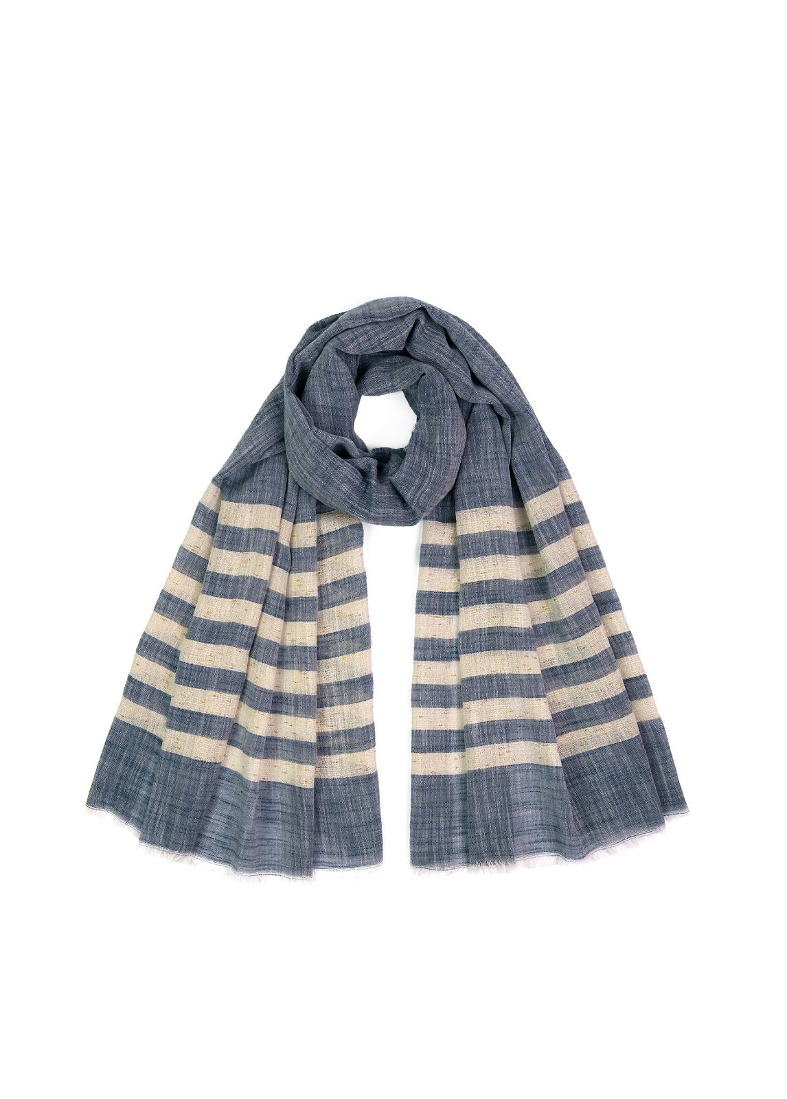 Tenká, vzdušná, elegantná šatka - zakončená jemnými strapcami - skvelý na prechodné obdobie aj ako doplnok počas letnej plážovej sezóny - textúra látky pripomínajúca ľan - má jemné ozdobné prúžky zakončené zlatou niťou, ktorá krásne odráža svetlo Zloženie: 50 % bavlna, 50 % polyester