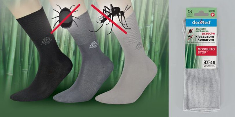 Bambusové ponožky proti kliešťom a komárom. Ponožky sú elastické a pri nosení netlačia. Model nebráni správnemu krvnému obehu. Malý prídavok lycry zaručuje maximálnu pružnosť ponožiek. Vďaka tomu môžete tieto ponožky nosiť aj na nohách s opuchmi. Ponožky sú bezšvové, priedušné a mimoriadne mäkké. Model možno nosiť pri problémoch s krvným obehom a počas rotácie. Ponožky chránia aj pred uštipnutím komármi a kliešťami. Zloženie: 80 % bambusová priadza, 17 % polyamid, 3 % lycra.