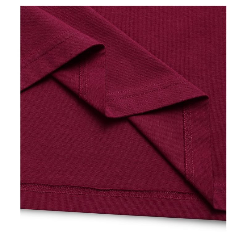 Jednoduchý džersej, 100 % bavlna (zloženie sa môže líšiť - farba 12 - 85 % bavlna, 15 % viskóza), enzymatická úprava bez štítku - pripravený na prelepenie, voľný strih s bočnými švami, neutrálny štítok s veľkosťou na zadnom výstrihu, výstrih ukončený rebrovaným úpletom 1:1 s 5 % elastanu, výstrih spevnený páskou z vrchnej tkaniny, spevňujúci šev na ramenách, predĺžená línia ramien, enzymatická úprava