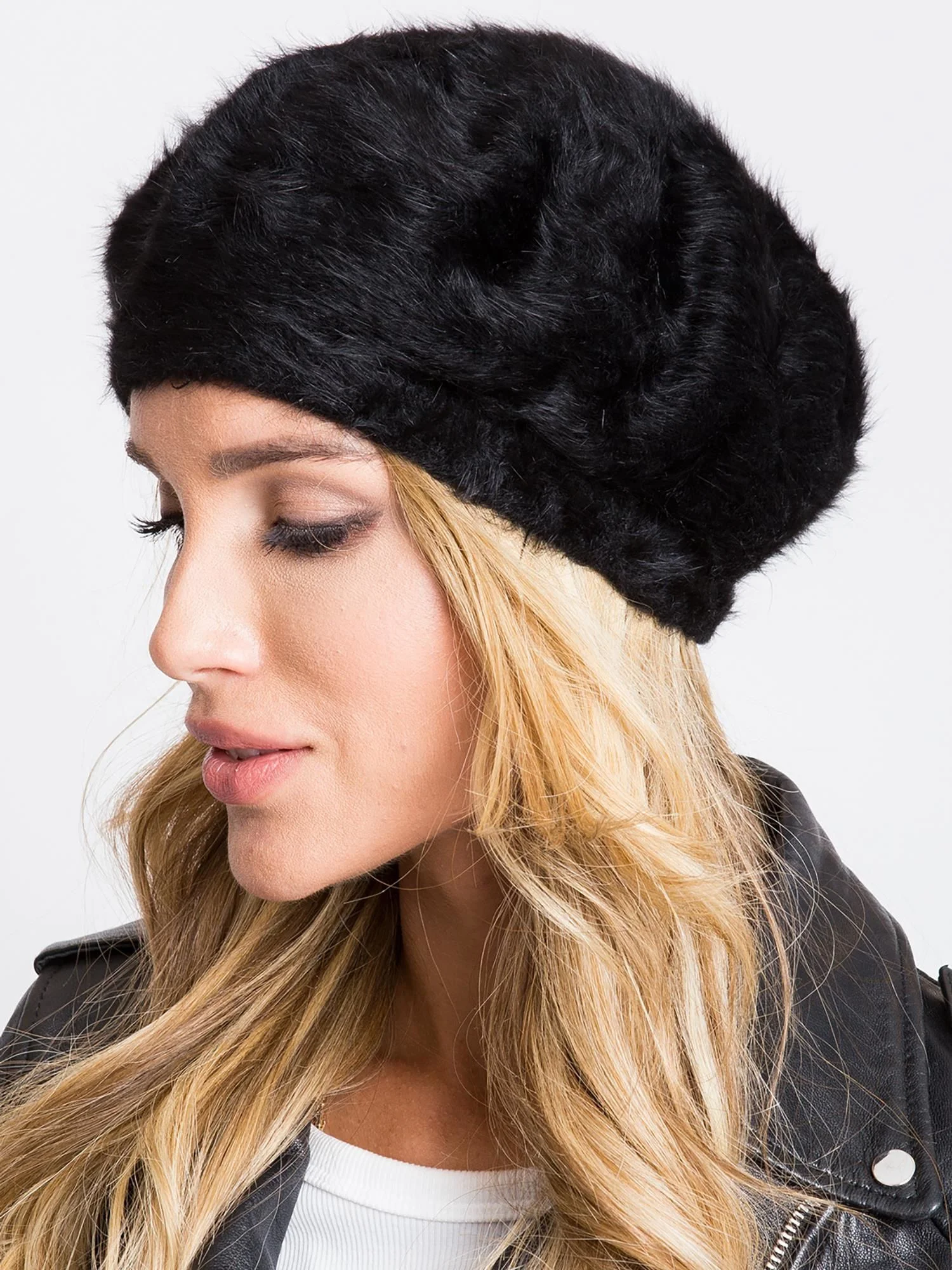 Dámska čiapka čierna. materiál: 70% angora, 30% nylon spôsob prania: pranie v práčke pri 30 °C Modelka má na sebe jednu veľkosť. Rozmery modelky: výška 170 cm, hrudník 82 cm, pás 60 cm, boky 88 cm.