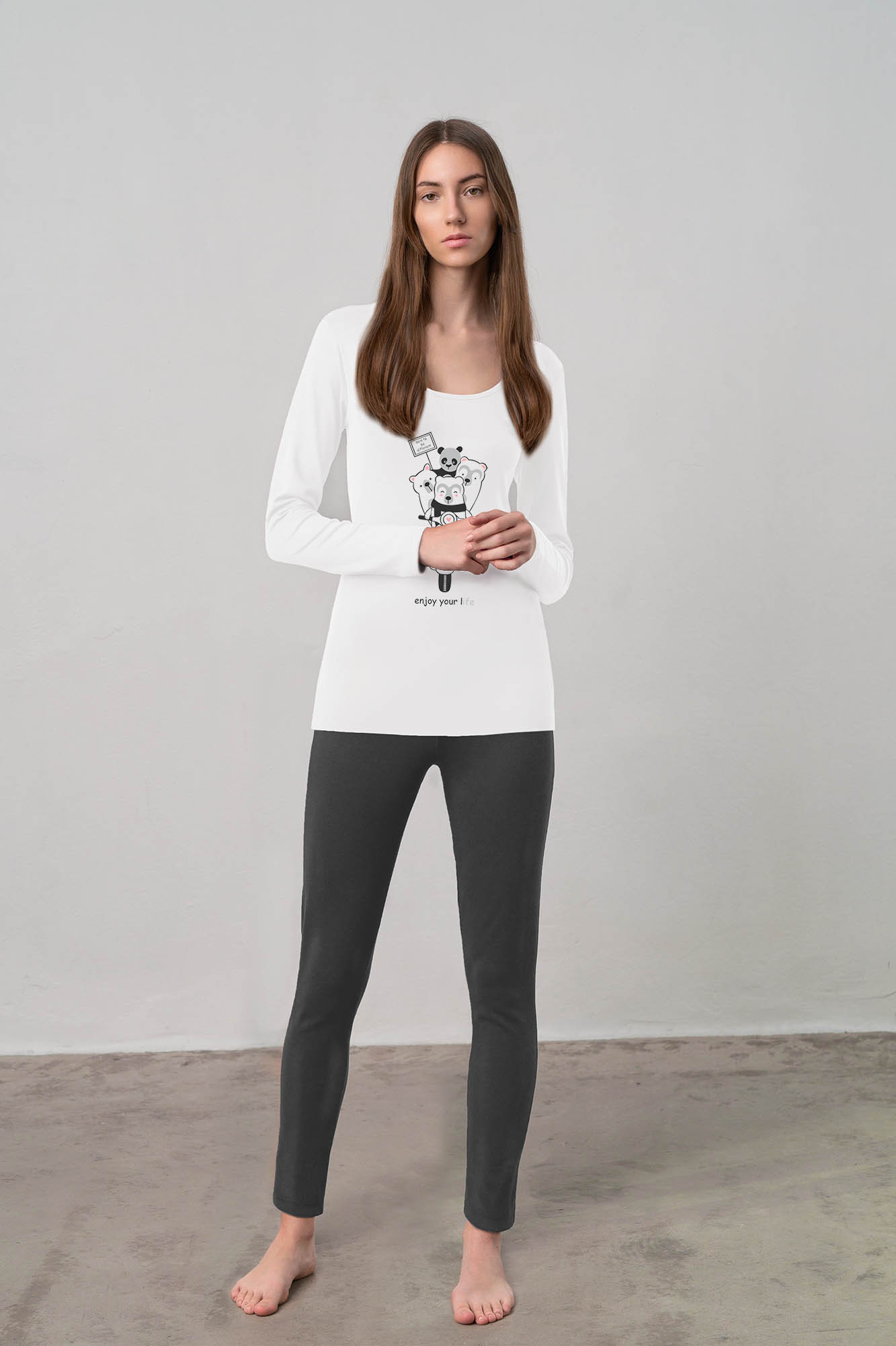 93% bavlnené rebrá + 7% elastan.Dĺžka vrchnej časti: 65 cm.Modelka má na sebe: Výška modelu: 175 cm.Vylepšite svoje zimné domáce oblečenie s našou dámskou pyžamovou súpravou, ktorá obsahuje jednofarebné nohavice v kombinácii so sviežim bielym topom. Blúzka s dlhými rukávmi sa môže pochváliť okrúhlym výstrihom a roztomilou potlačou, ktorá dodá vášmu spacáku šmrnc. Táto súprava je vyrobená z pružného bavlneného rebrového úpletu a ponúka mäkký, elastický strih, ktorý vám zaručí pohodlie počas celej noci. Vďaka svojmu regular strihu je ideálna na relaxáciu doma alebo na príjemný večer.