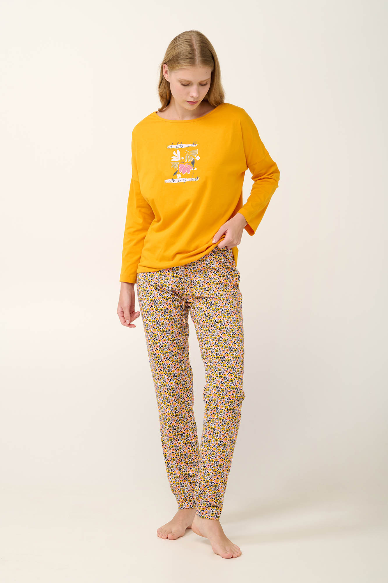 100% bavlna S. Jersey. Dĺžka vršku: 65 cm. Modelka má na sebe:   Výška modelky: 175 cm.Spríjemnite si chladné noci s týmto zimným dámskym pyžamom vo veselých žltých odtieňoch. Nohavice s kvetinovou potlačou sú kombinované s topom s kvetinovou potlačou na hrudi, ktorý zabezpečí zladený vzhľad. Táto súprava je vyrobená zo 100% bavlneného jednolícneho džerseja a ponúka priedušnú mäkkosť a hrejivosť. Vďaka regular strihu je navrhnutá pre pohodlie, takže je ideálna pre útulné večery alebo pokojný spánok a snúbi sa v nej praktickosť s nádychom kvetinového pôvabu. Súprava je vyrobená z kvalitného materiálu.